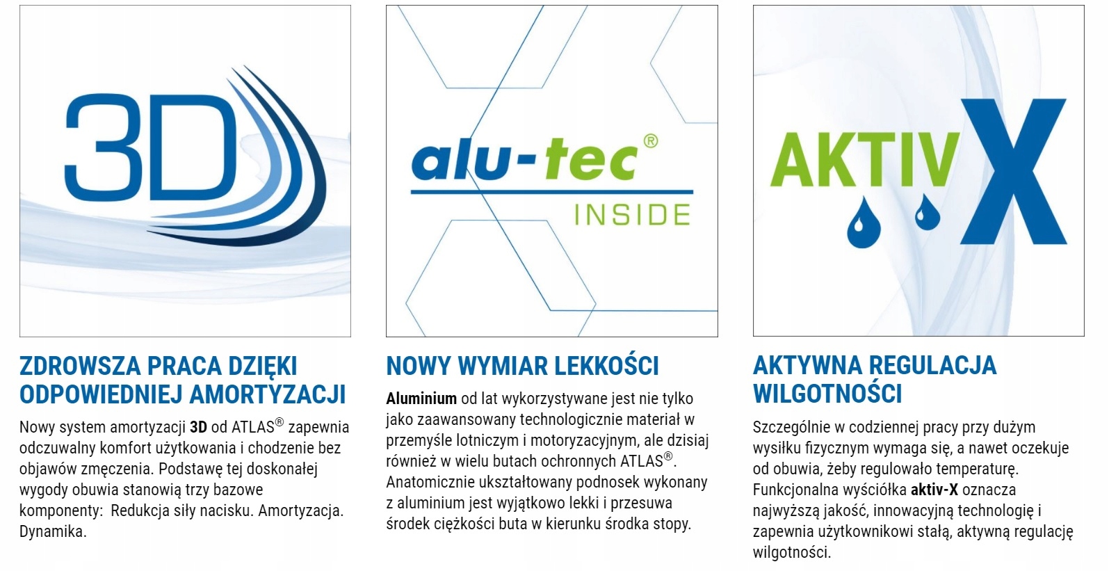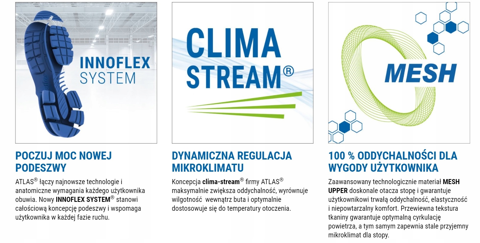 Використана у взутті система CLIMA-STREAM, запатентована компанією ATLAS, стимулює постійну температуру всередині взуття. рівень взуття 31 градус Цельсія. Підкладка, виготовлена за технологією AKTIV-X, забезпечує сухість всередині взуття навіть для людей, які скаржаться на підвищену пітливість ніг.