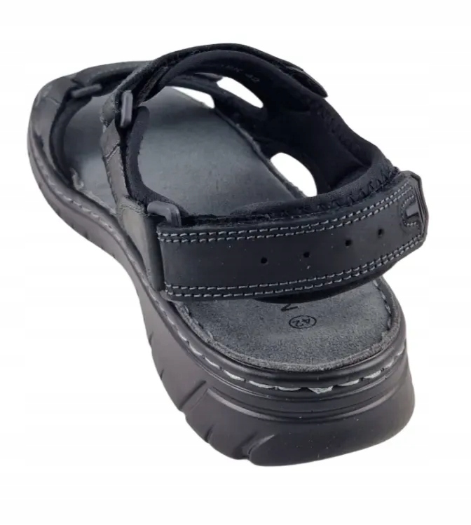 Чоловічі босоніжки з чорних походів. Виготовлений з постійної натуральної шкіри в тіні темно -коричневого. М'яка, натуральна замша вставити для більшого комфорту. Сандалі мають регульовані ремінці на липучках для кращого пристосування. Чорна, густа підошва, виготовлена з міцного пластику, що забезпечує гарну подушку. Ідеально підходить для літа - для повсякденного використання, для свят або легких похідних поїздок.