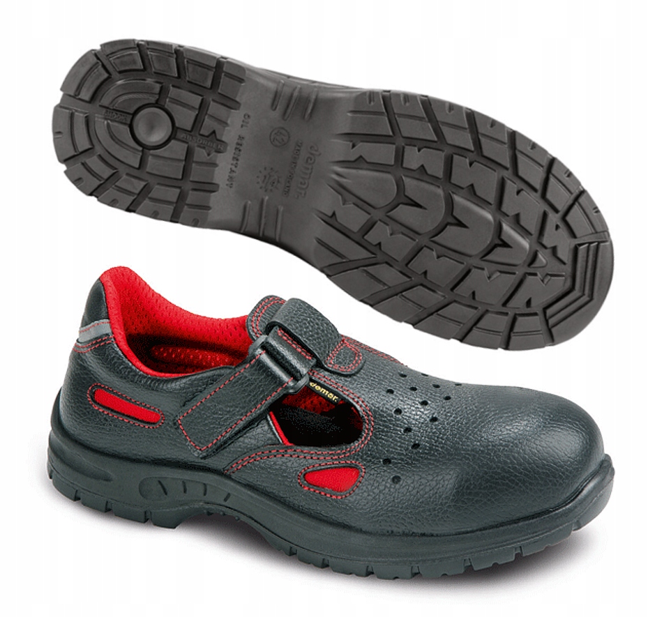 КЛАСИЧНІ, ЛЕГКІ РОБОЧІ САНДАЛІ, ідеальні для роботи в сухих умовах, чорно-червоного кольору з контрастними червоними швами та світловідбиваючими елементами. Дуже практичний і зручний, може використовуватися у важкій і легкій промисловості.