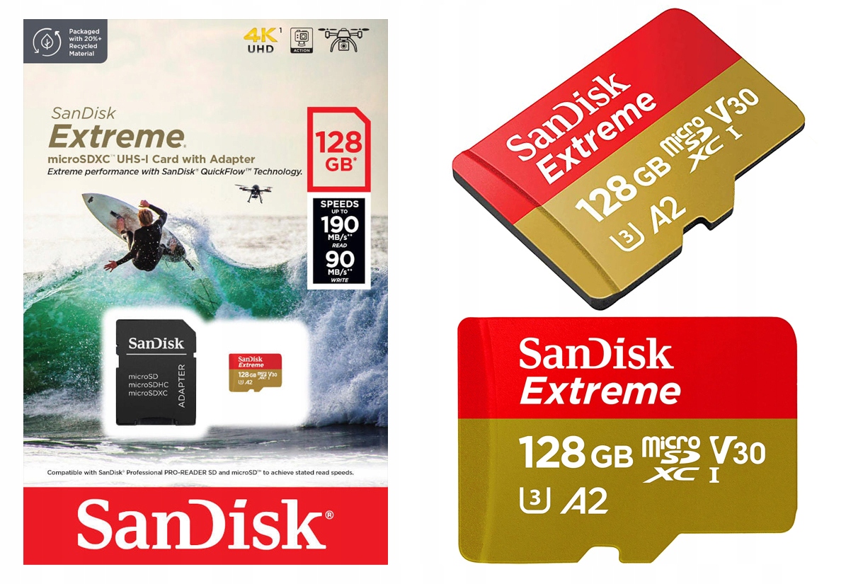 SanDisk Extreme® microSDXC™ використовує величезну швидкість майже миттєво передача даних, ефективна робота програм і відео в якості 4K UHD. Карта ідеально підходить для смартфонів Android™, екшн-камер і дронів. Він гарантує високу продуктивність і дозволяє записувати відео в 4K UHD і Full HD і фотографувати у високій роздільній здатності.