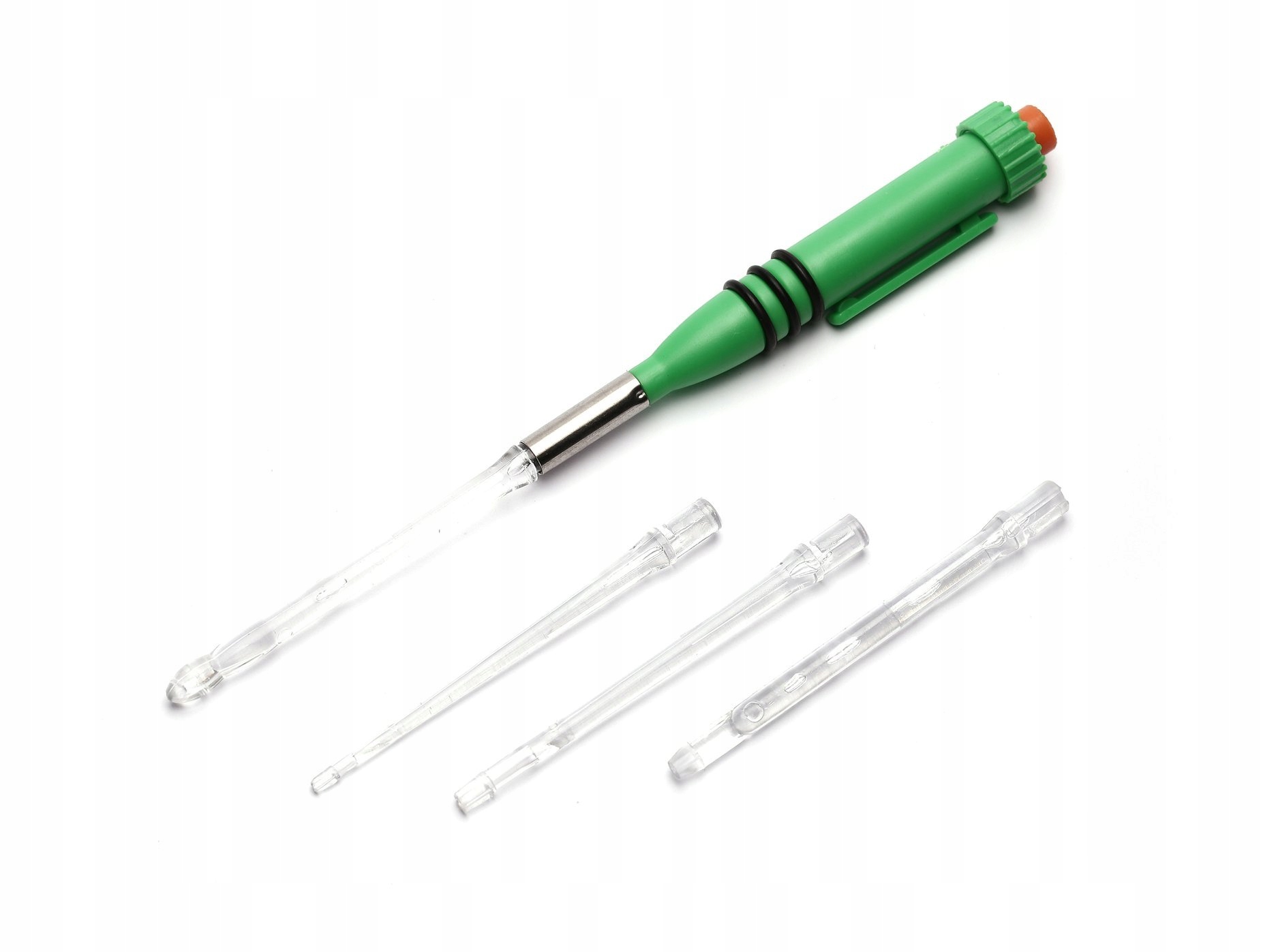 Цей допоміжний пристрій оснащено 4 різними наконечниками для зняття гачків, які підсвічуються зсередини як спеціальна функція.
