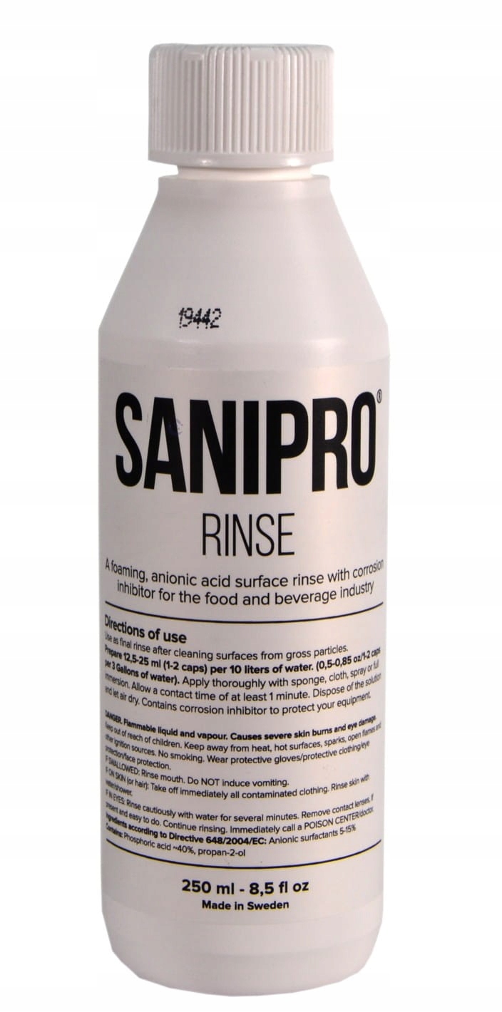 Ополіскувач Sanipro - сильно піноутворюючий засіб для дезінфекції енологічного та пивоварного обладнання, який завдяки цій формулі має дуже сильну (дезінфікуючу) дію. Він не має запаху, смаку і не залишає плям. Має інгібітор корозії, тому ідеально підходить для дезінфекції приладів з нержавіючої сталі. Цей препарат забезпечує дуже ефективну дезінфекцію та дуже стабільний у широкому діапазоні температур. Саніпро ми використовуємо на завершальному етапі дезінфекції обладнання, тобто після миття. Змивати після використання не потрібно і навіть не рекомендується. Найкраще залишити до повного висихання.