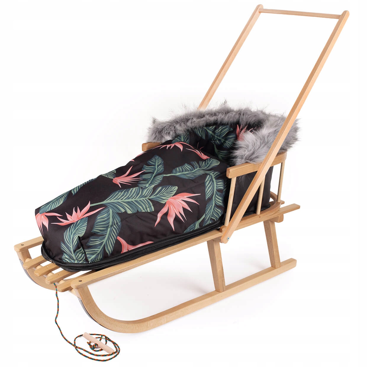 - W набір: дерев'яні санки, спинка, штовхач (знімний), шнурок з ручкою та спальний мішок