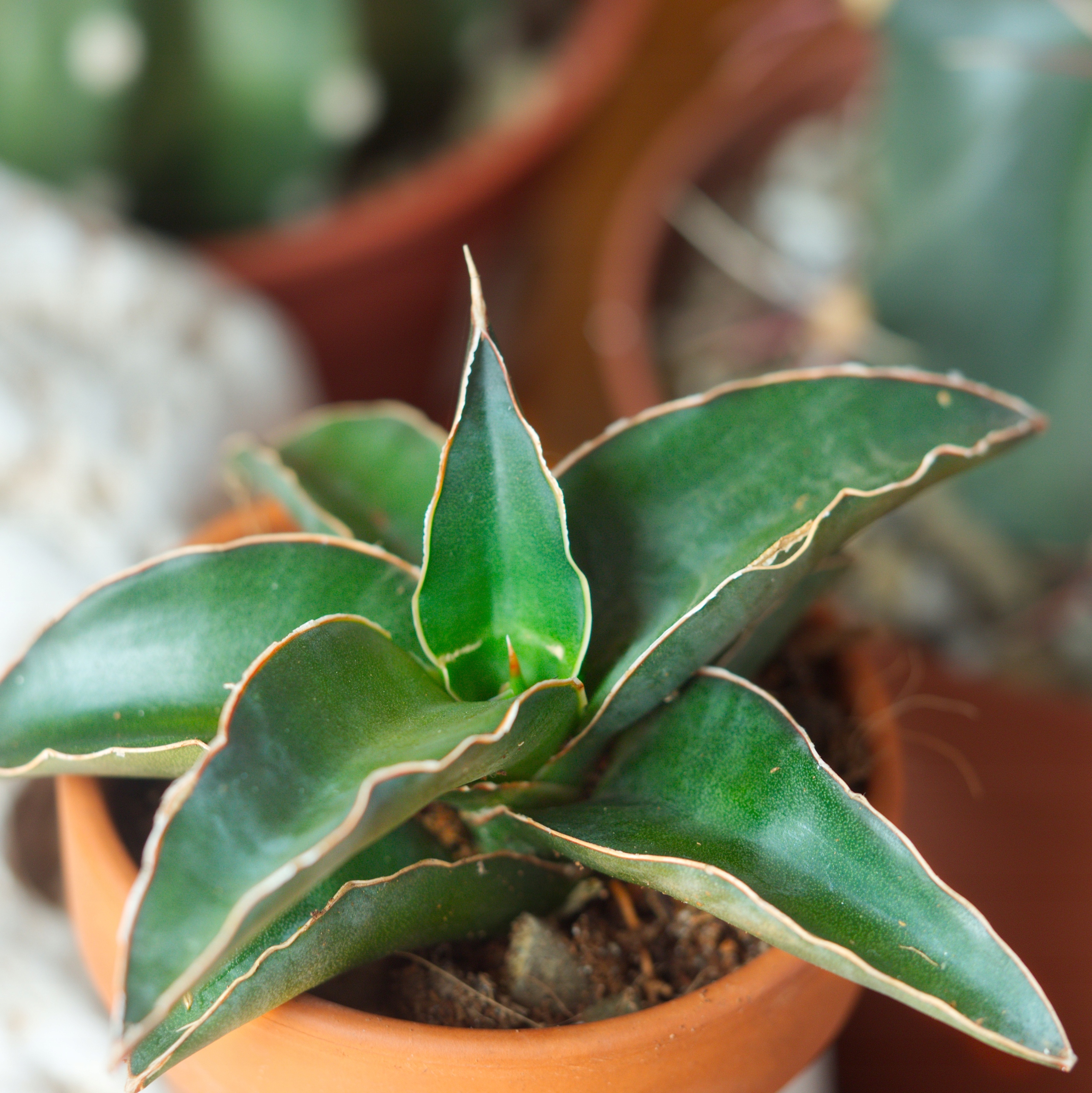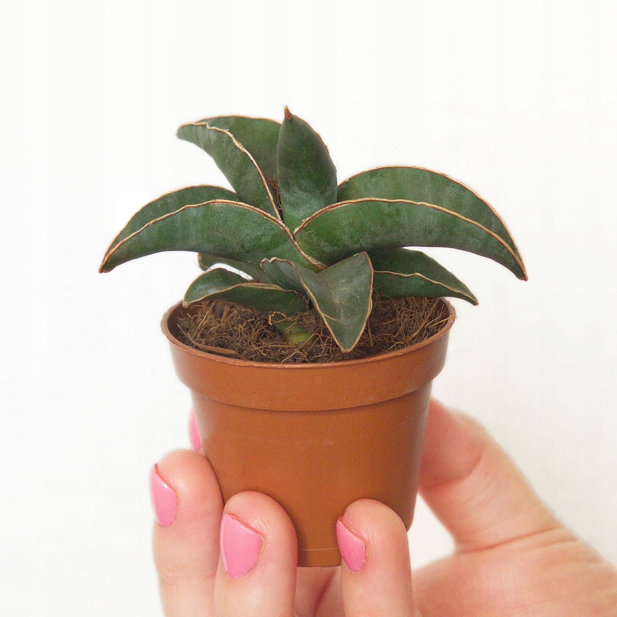 Сансев'єрія робуста – екзотична зміїна рослина, яка створює оригінальну розетку. Його листя у формі жолоба темно-зелені, з коричневою тонкою лінією по краях. Вони мають гострі кінці, а поверхня гладка і злегка блискуча. Ця сансевієрія ідеально підходить для посадки з іншими невеликими сукулентами. Його темний колір буде чудово контрастувати зі світлими рослинами, створюючи феноменальну композицію.