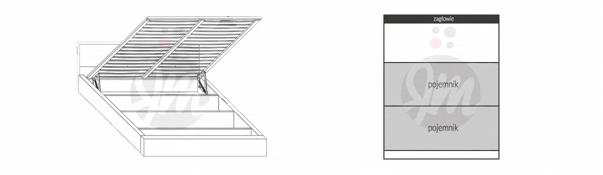- Ліжко має дерев'яний каркас із фанери та пружинних планок, які піднімаються на пружинних підйомниках