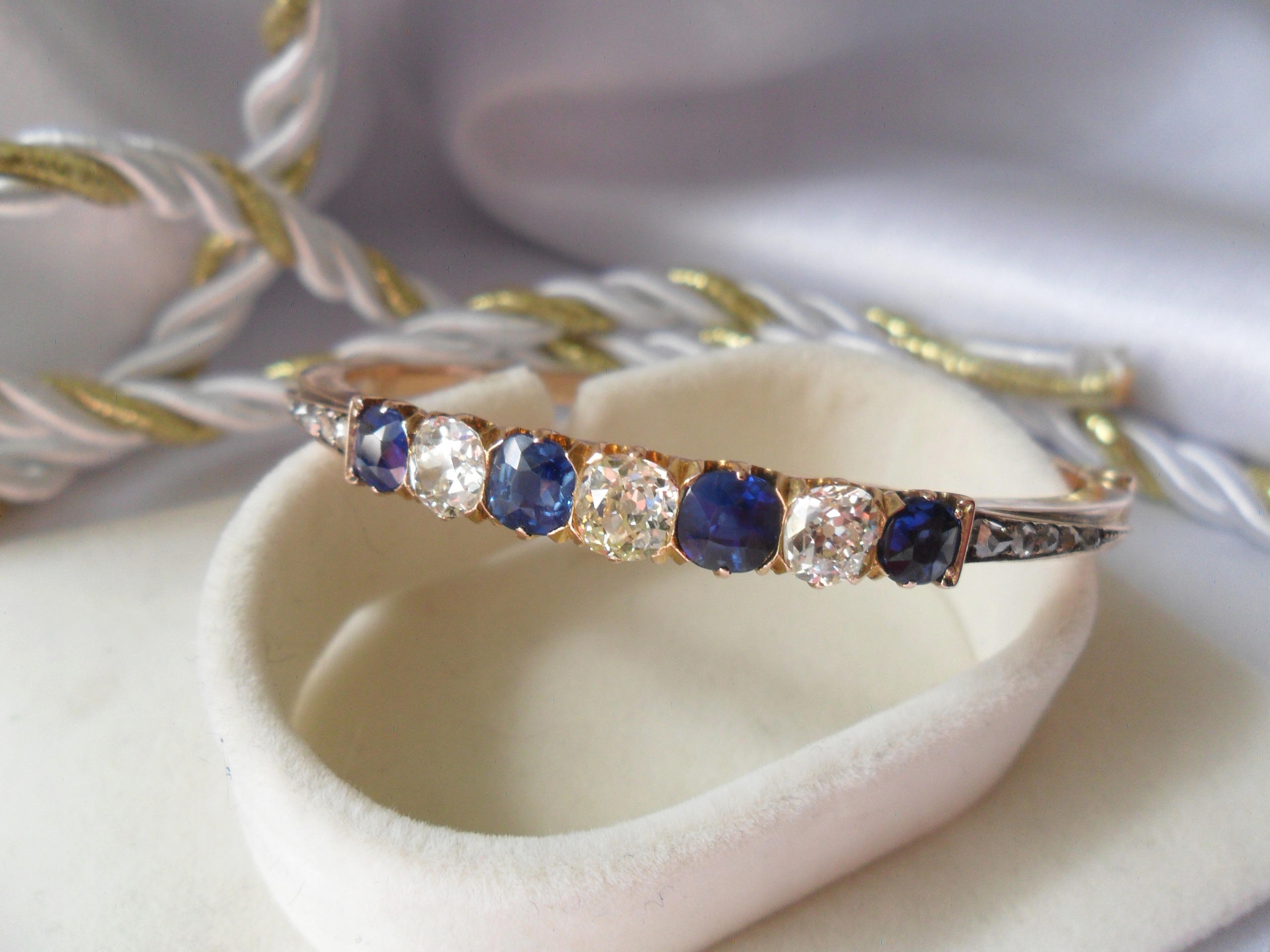 Чудовий браслет із золота 585 проби (підпис золота 585 проби на застібці та знак виробника). Камені ; Природні алмази та сапфіри. Діаманти в найкрасивішій огранці Old Brilliant у формі старовинного овалу - подушки. Три великі діаманти вагою прибл. приблизно 2,05 карата. Прозорість VS - SI. Білий колір H - K (середина з ніжними жовтими відблисками). Розміри ромба; приблизно 5,65 мм, висота приблизно 3 мм = приблизно 0,60 ct, приблизно 6 мм x 5,8 мм, висота приблизно 3,5 мм, = приблизно 0,75 ct, приблизно 5,7 мм x 5,6 мм, висота приблизно 3,5 мм = приблизно 0,70 карат. Інші діаманти / 12 штук у старих неправильних огранках, вагою прибл. приблизно 0,38 карата. Сапфіри темно-синього кольору: по два, вагою прибл. приблизно 1 кар. , і два вагою прибл. приблизно 0,70 карата. Загальна вага діамантів - приблизно 2,43 карата та сапфірів вагою приблизно 0,70 карата. 3,40 карат.Діаметр браслета 57 мм х 50 мм. Вага 10800 грам. Стан як на фото. Можливість покупки в розстрочку. Аукціон не включає упаковку.