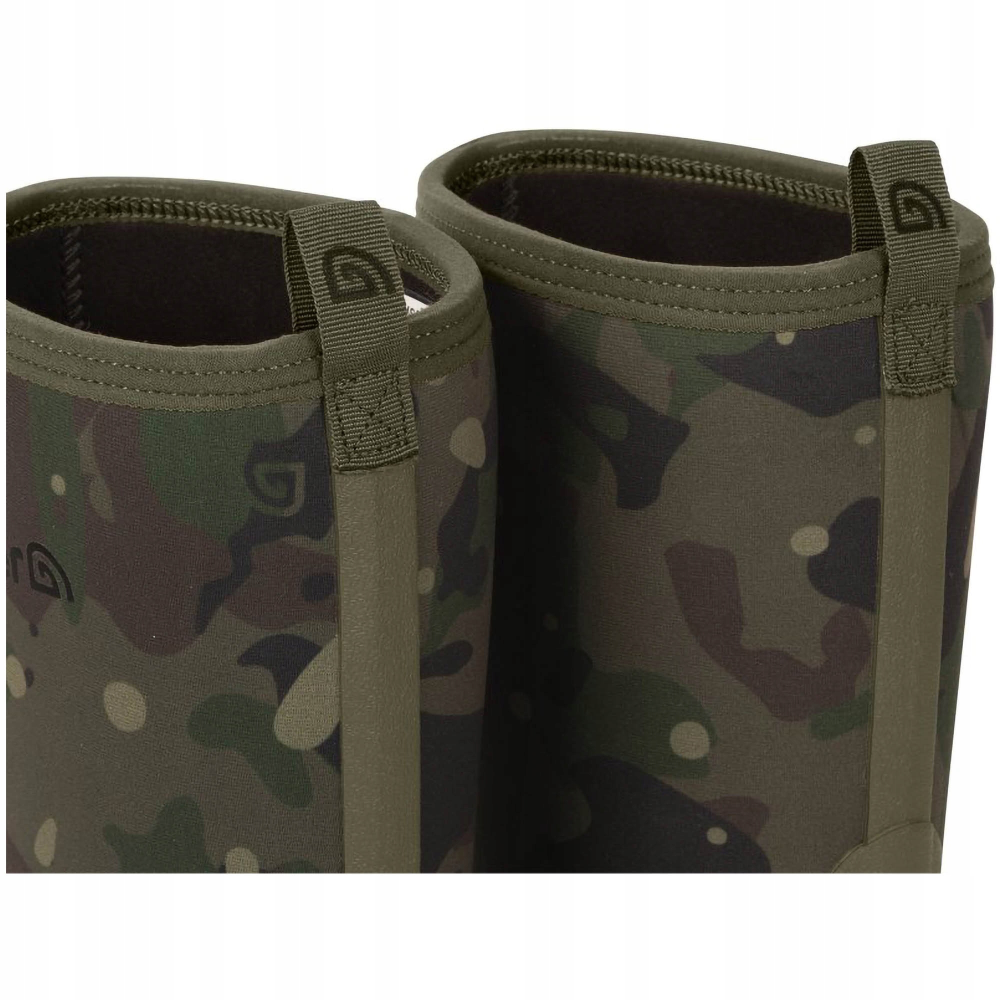 Верхня частина взуття виготовлена з неопрену в унікальному камуфляжному малюнку, який забезпечує тепло, адаптується до ноги та підвищує комфорт використання під час тривалих подорожей. Нижня частина взуття виготовлена з міцної водонепроникної гуми, стійкої до механічних пошкоджень і намокання.