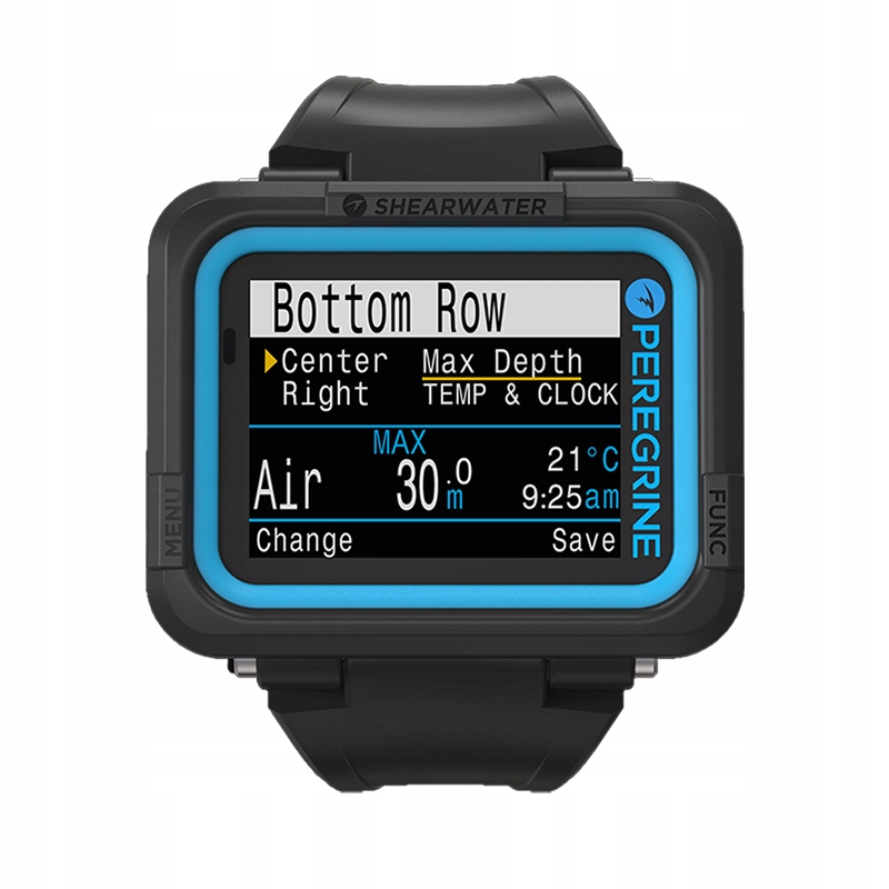 Простий, інтуїтивно зрозумілий макет, зручна навігація. Почніть свою пригоду з підводним комп’ютером Shearwater. Peregrine — це простий і легкий у використанні кольоровий комп’ютер для занурення з декількома газами. Сапсан є ідеальним компаньйоном для багатьох підводних пригод. З Peregrine ми спростили операції та створили комп’ютер, який простий у використанні для дайверів будь-якого рівня досвіду. Кольоровий РК-дисплей 2,2 дюйма. Максимальна глибина до 120 м. Повітряний, одногазовий і багатогазовий режими Nitrox. Спрощені режими занурення. Немає блокування відхилень у плані занурення. Відстеження ЦНС. Швидка NDL і повна декомпресія. Вбудований планувальник. Повна підтримка декомпресії. Bühlmann ZHL- 16C з градієнтними факторами Програмована частота дискретизації глибини Передача журналів занурень через бездротові дані Передача інтелектуальних технологій до Shearwater Cloud і безкоштовних оновлень програмного забезпечення Гумовий амортизаційний шнур також включено Додаткові ремінці доступні у 2 кольорах Peregrine найкраще підходить для дайверів на повітрі та нітроксу, яким потрібен високоточний екран за винятковою ціною зі спрощеним набором функцій. Характеристики: Комп’ютер декомпресії Повітряний режим (для рекреаційного дайвінгу) Режим нітрокс (один газ до 40%) 3 газові режими нітрокс (до 100% O2) Режим манометра Кнопки з нержавіючої сталі 316 Вібросигнали Технологія бездротової передачі даних Функція оновлення програмного забезпечення 26 мм силікон ремінець із застібкою з нержавіючої сталі Нейлоновий балістичний полімерний корпус Peregrine Технічні характеристики: Роздільна здатність екрана - 320x240 QVGA Тип дисплея - РК-світлодіодний кольоровий дисплей Розмір дисплея - 2,2"/5,59 см Вага (тільки підводний комп'ютер) - 122 г Розмір - 77 мм x 68 мм x 25 мм Тип батареї - Літій-іонний акумулятор Замінено на заводі Час роботи від одного заряду - до 30 годин (середня яскравість) Бездротова зарядна станція - в комплекті Кількість газів - 3 OC Максимальна глибина - 120 м / 394 фута Ємність журналу занурень - 200 годин Чорний ремінь - в комплекті Шнурок – включено Додаткові доповнення та аксесуари: Кольори браслета: синій (синій океану) білий