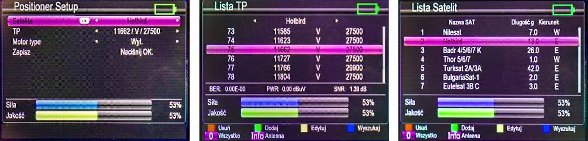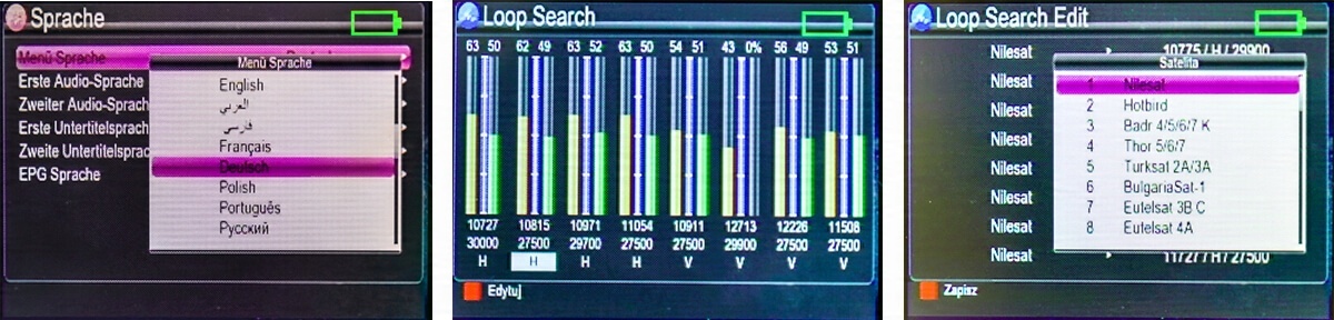 - Вибір супутника з частотою (супутниковий транспондер) з налаштуваннями порту DiSEqC. Підтримка конвертерів Unicable I з можливістю введення до 8 параметрів SCR і Unicable II з можливістю введення до 32 параметрів SCR