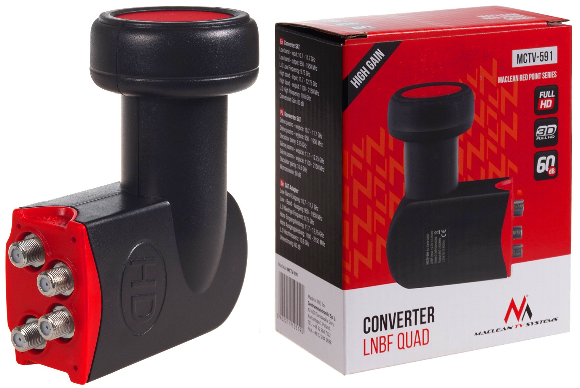 Точне виконання та високі технічні параметри сприяють меншому впливу погодних умов на якість прийнятого сигналу. Квадроцикл - чотири одинарних перетворювача в одному корпусі. Він працює автономно з чотирма супутниковими приймачами або двома з реєстратором. Конвертер Quad Maclean MCTV-591 дозволяє одночасно записувати та дивитися різні канали з різних діапазонів і поляризацій (V і H).