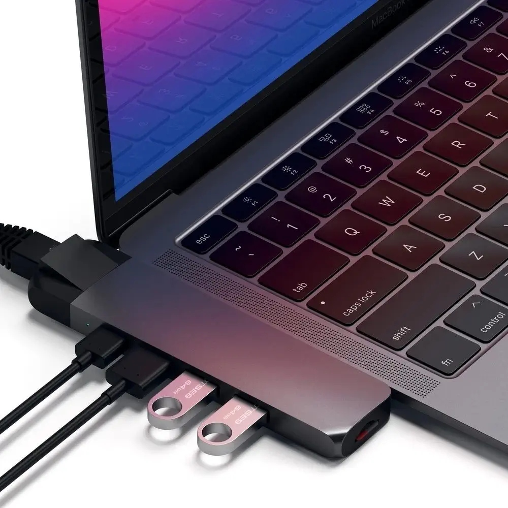 Представляємо алюмінієвий концентратор Satechi з Ethernet Type-C Pro, розроблений ексклюзивно для MacBook Pro 2016/2017, моделі 13 і 15 - дюйм. Оснащений портом Gigabit Ethernet, USB-C Power Delivery (до 87 Вт), 2 портами USB 3.0 і слотом для карт micro та SD для задоволення всіх ваших потреб у передачі даних. Завдяки матовому алюмінієвому покриттю, Type-C Hub Pro з Ethernet доповнює аксесуари та настільне обладнання Apple. Просто підключіть його, щоб розширити можливості свого MacBook Pro.