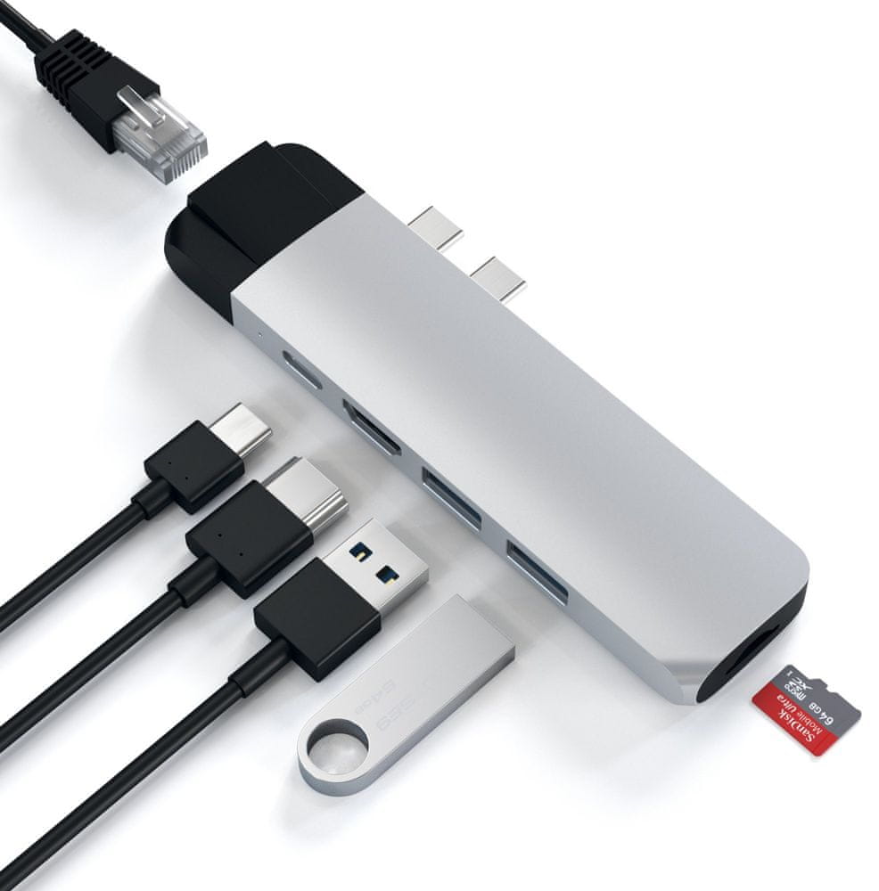 Представляємо алюмінієвий концентратор Satechi з Ethernet Type-C Pro, розроблений ексклюзивно для MacBook Pro 2016/2017, моделі 13 і 15 - дюйм. Оснащений портом Gigabit Ethernet, USB-C Power Delivery (до 87 Вт), 2 портами USB 3.0 і слотом для карт micro та SD для задоволення всіх ваших потреб у передачі даних. Завдяки матовому алюмінієвому покриттю, Type-C Hub Pro з Ethernet доповнює аксесуари та настільне обладнання Apple. Просто підключіть його, щоб розширити можливості свого MacBook Pro.