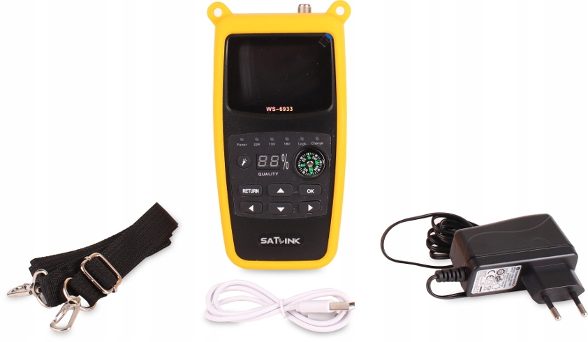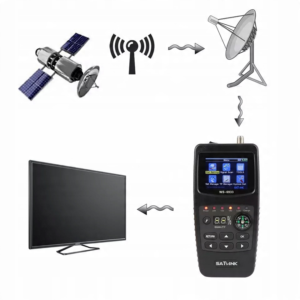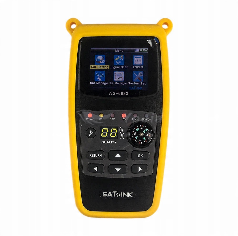 Простий вимірювач супутникового сигналу від Satlink, модель WS-6933 HD Compact із кольоровим рідкокристалічним дисплеєм, що дозволяє легко й точно налаштувати супутникову антену на правильний супутник .
