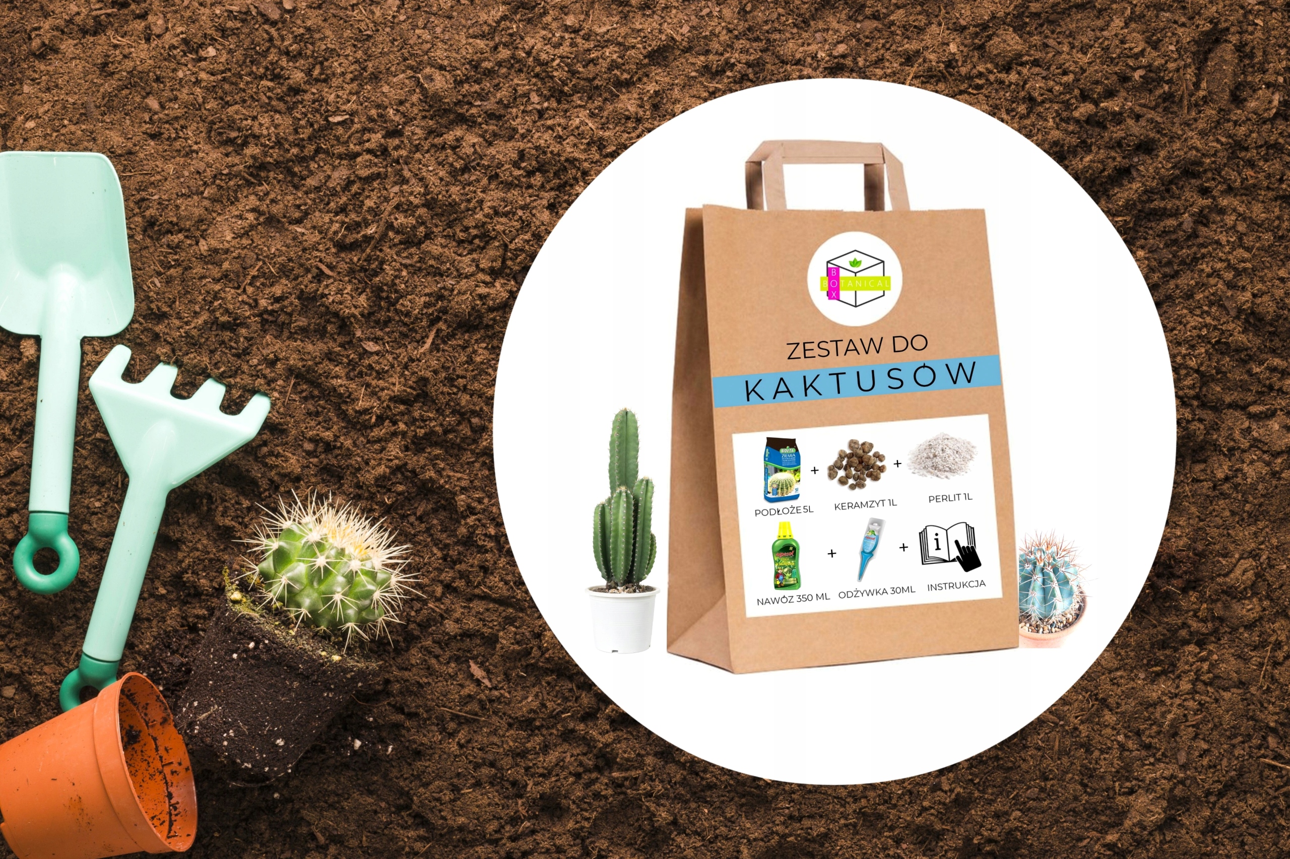 ботанічна коробка пропонує повний комплект трансплантації - розсада кактусів та сукулентів (Sansevieria, Aloe, Agawa, Eeszeria (Echeveria), Wolfomlecz (Euphorbia), Patyczak (rhipsalis), Live Stones (Lithops), Rojnik, Fat, тощо)