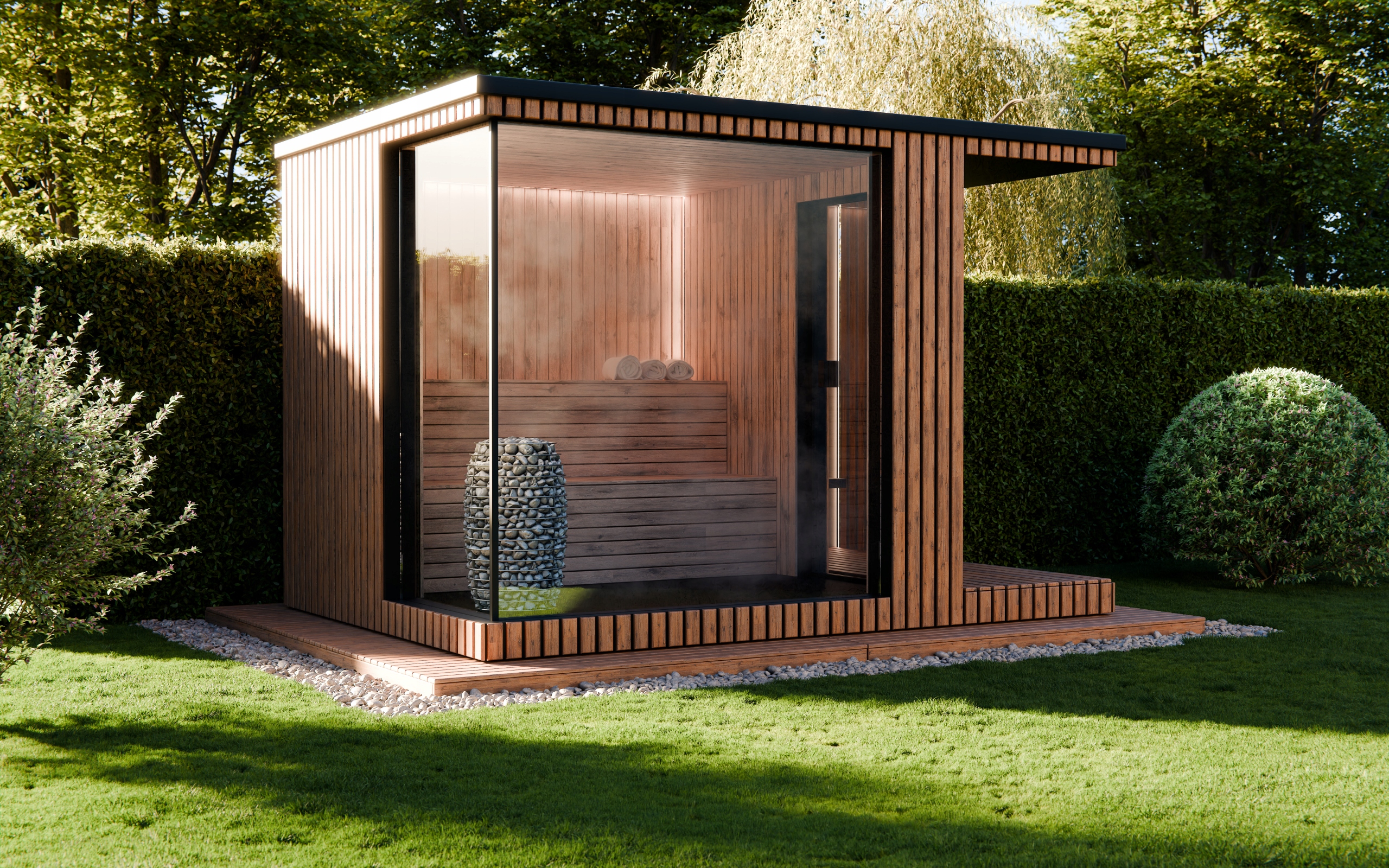 Sauna ogrodowa Iris z prysznicem szyba panoramiczna piec HUUM