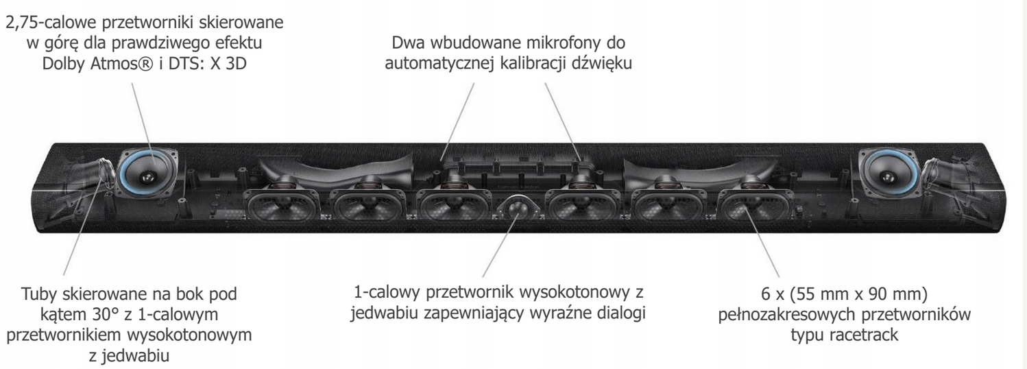 Звукова панель все в одному з 11 перетворювачами, включаючи два 2,75 -дюймові канали, спрямовані вгору, ефект справжнього Dolby Atmos®, забезпечує точний звук навіть при значному обсязі, і багатопрофільна технологія ™ створює більш широку звукову сцені, яка заповнює всю кімнату без необхідності додаткових проводів, незалежно від того, який тип фільмів та серії спостерігається, багатофункціональна функція Harman Kardon, прибуток 1100 змін у цільорі 3 -х заповнення Cinera Harman Karardon, прибуток 1100. просторовий звук - під час перегляду бойовиків із супергероями, гучний футбольний матч або слухання улюбленого списку відтворення.