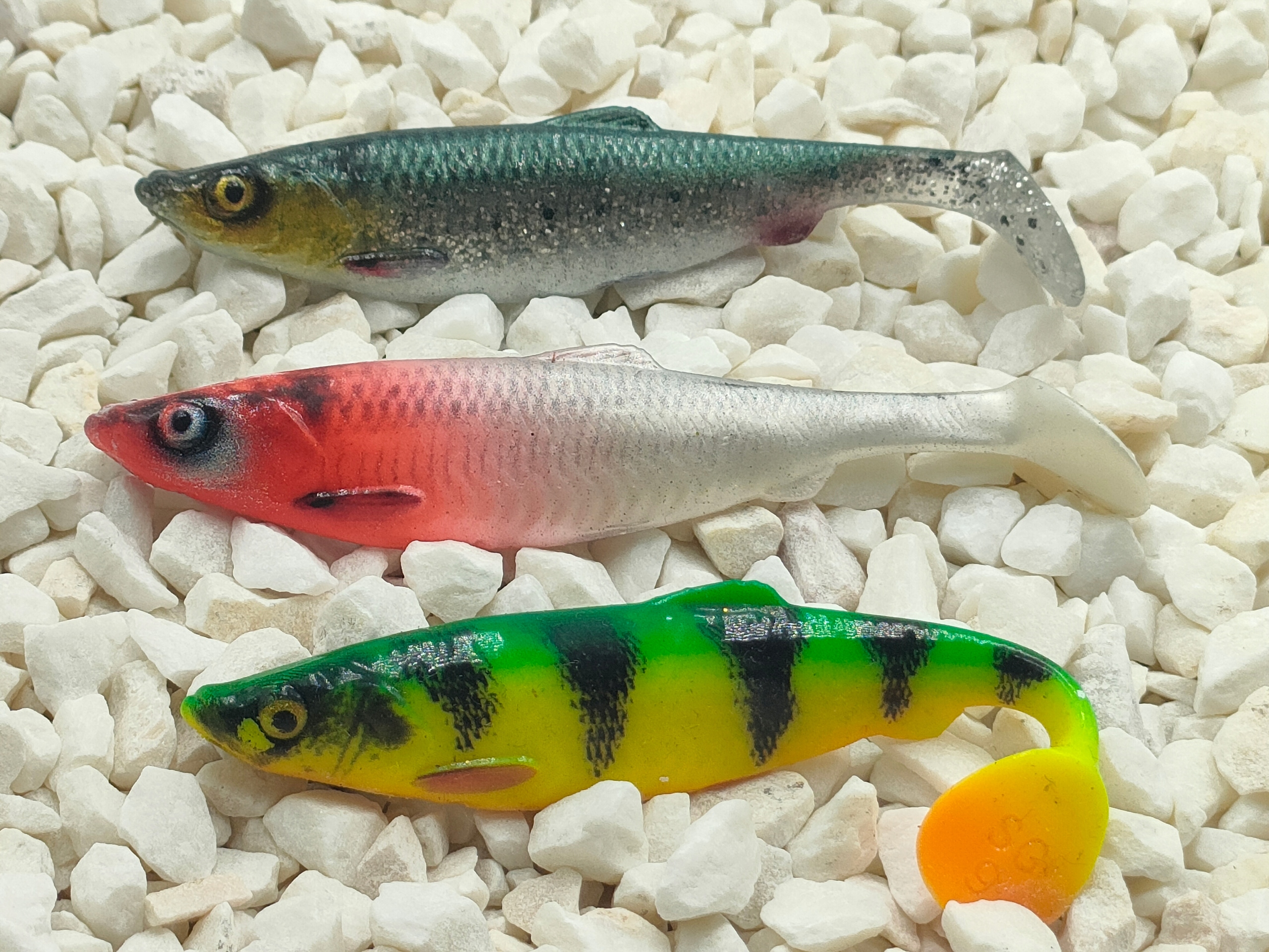 Як безкоштовний подарунок я додаю три м’які приманки, зображені на фото, довжиною 9 см, які також дуже ефективні під час лову судака та окуня.