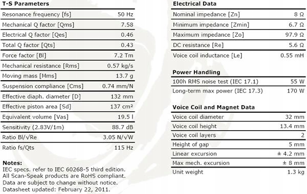 Кошик з литого алюмінію, вентиляція під нижньою підвіскою, мембрана зі скловолокна з вирізами NRSC, гумова підвіска з низькими втратами.