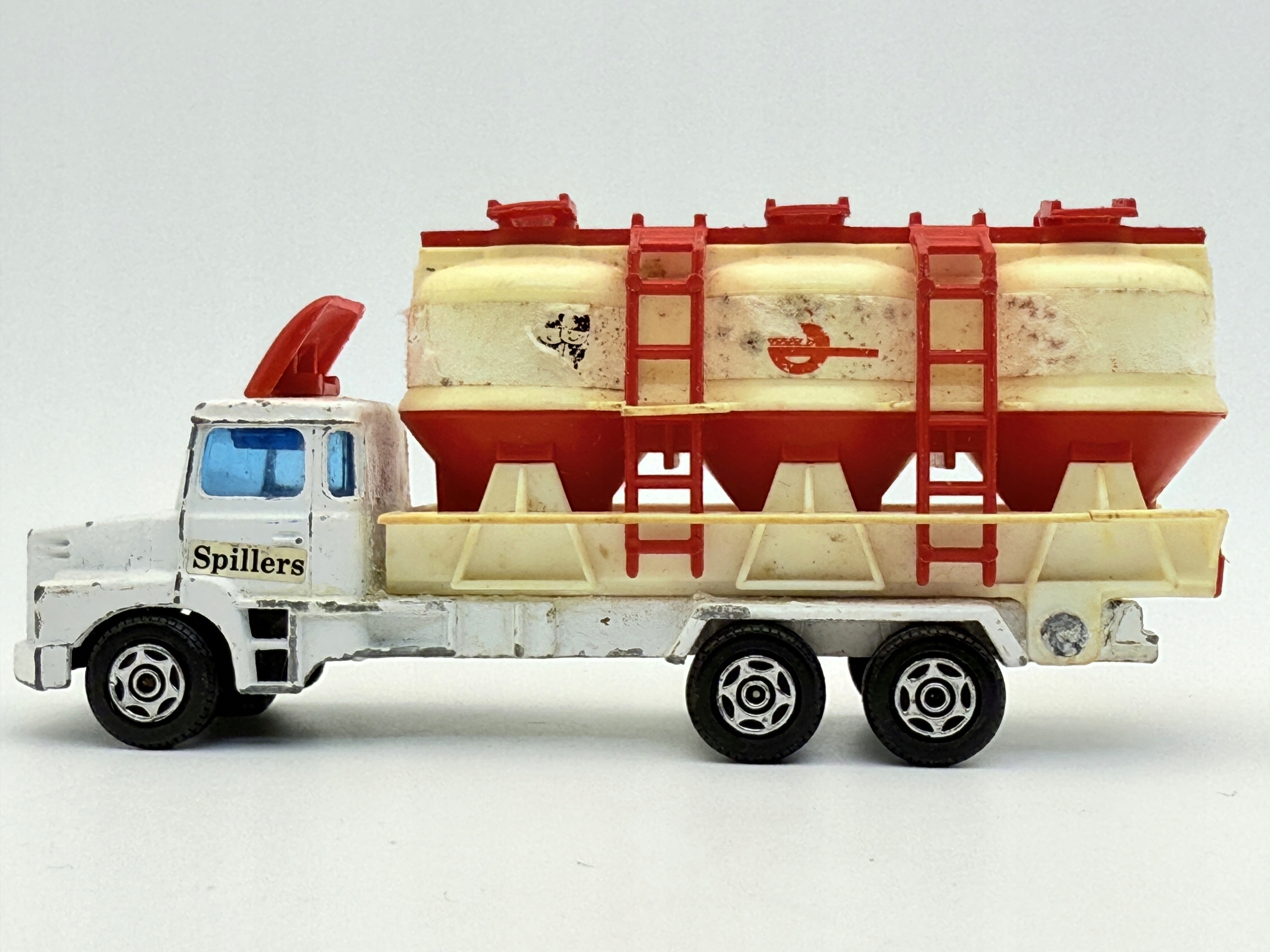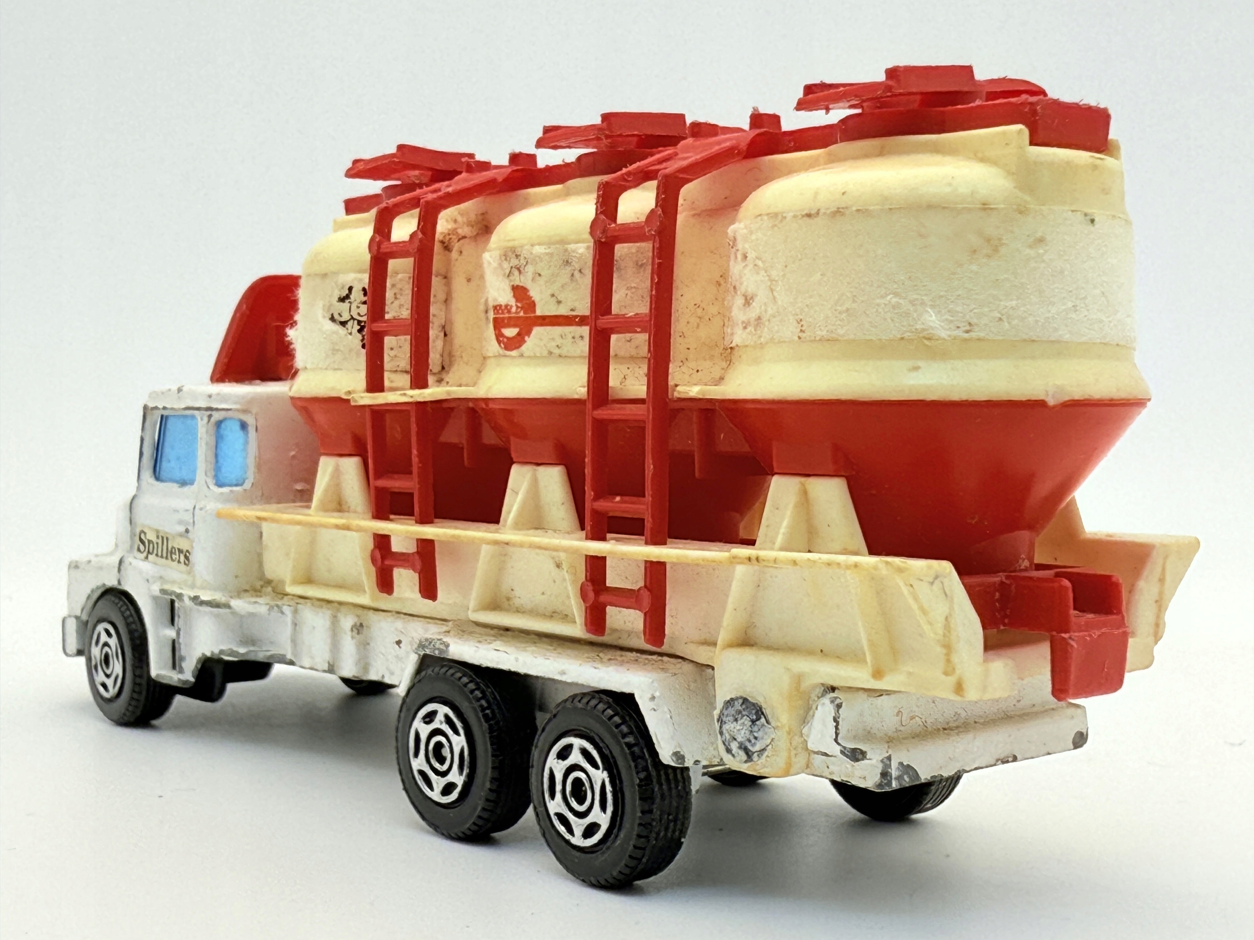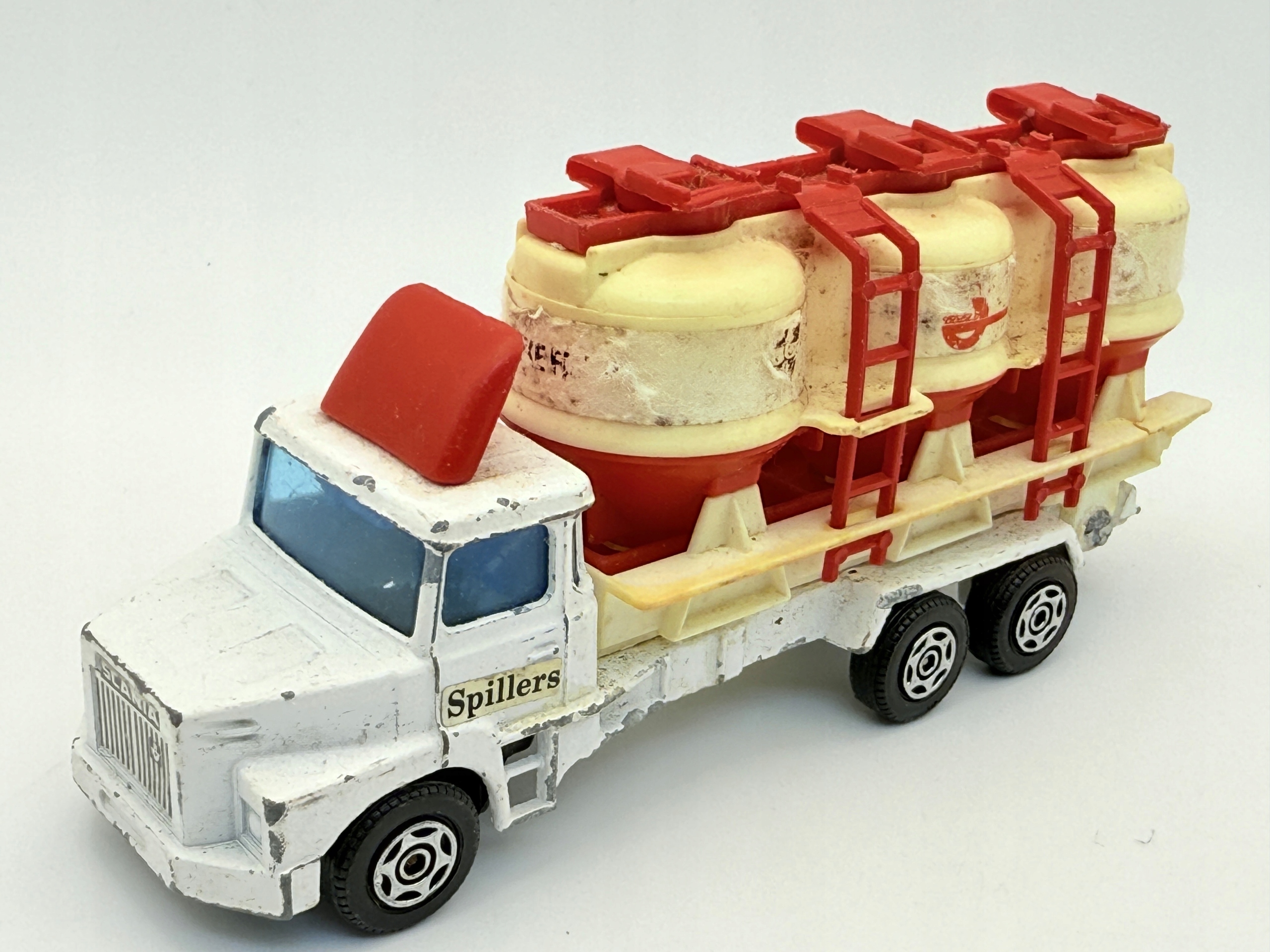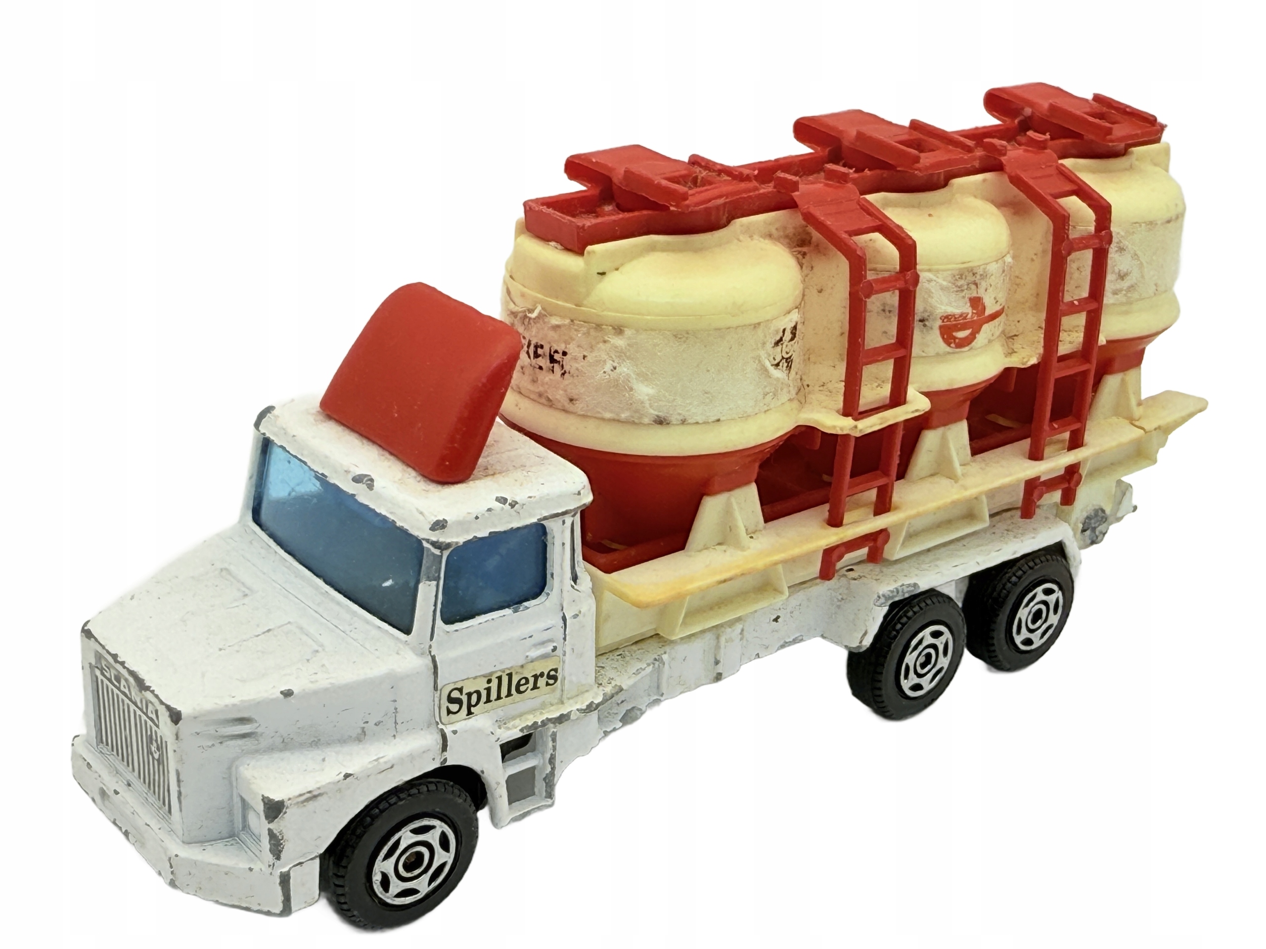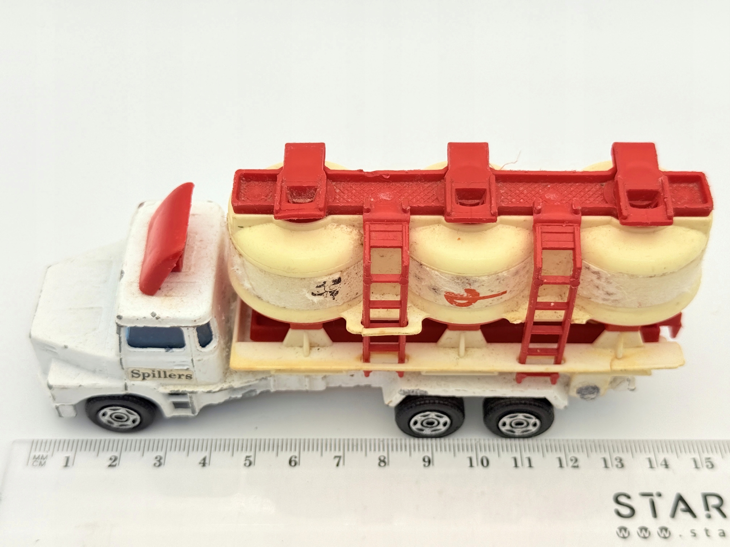 Весняна модель демонструє вантажівку Scania з унікальним напівпричепом, оснащеним трьома великими танками. Зроблена з металу та пластику, пружина характеризується суцільною конструкцією та деталями, такими як «відбитки шпильок» та реалістичні вікна. Його кольори поєднуються з білими з червоними та кремовими акцентами, що надає йому виразний вигляд. Хоча деякі ознаки використання видно, модель все ще зберігає свою чарівність і є привабливою для колекціонерів.