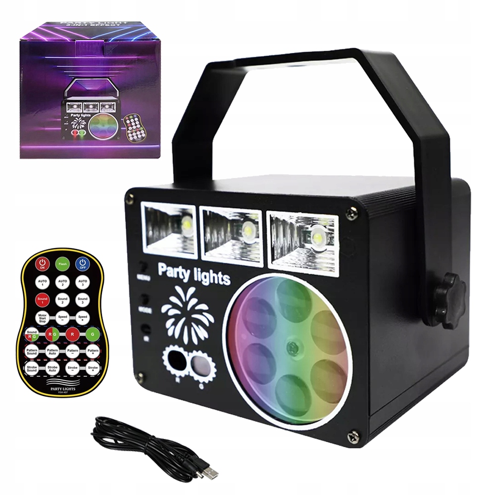 - Це вдосконалене світло 3 -в 1 дискотеки містить обертове світло з створом, зеленим та зеленим світлодіодним світлом та білим світлодіодним світлом із строб/ультрафіолетовою хвилею.
