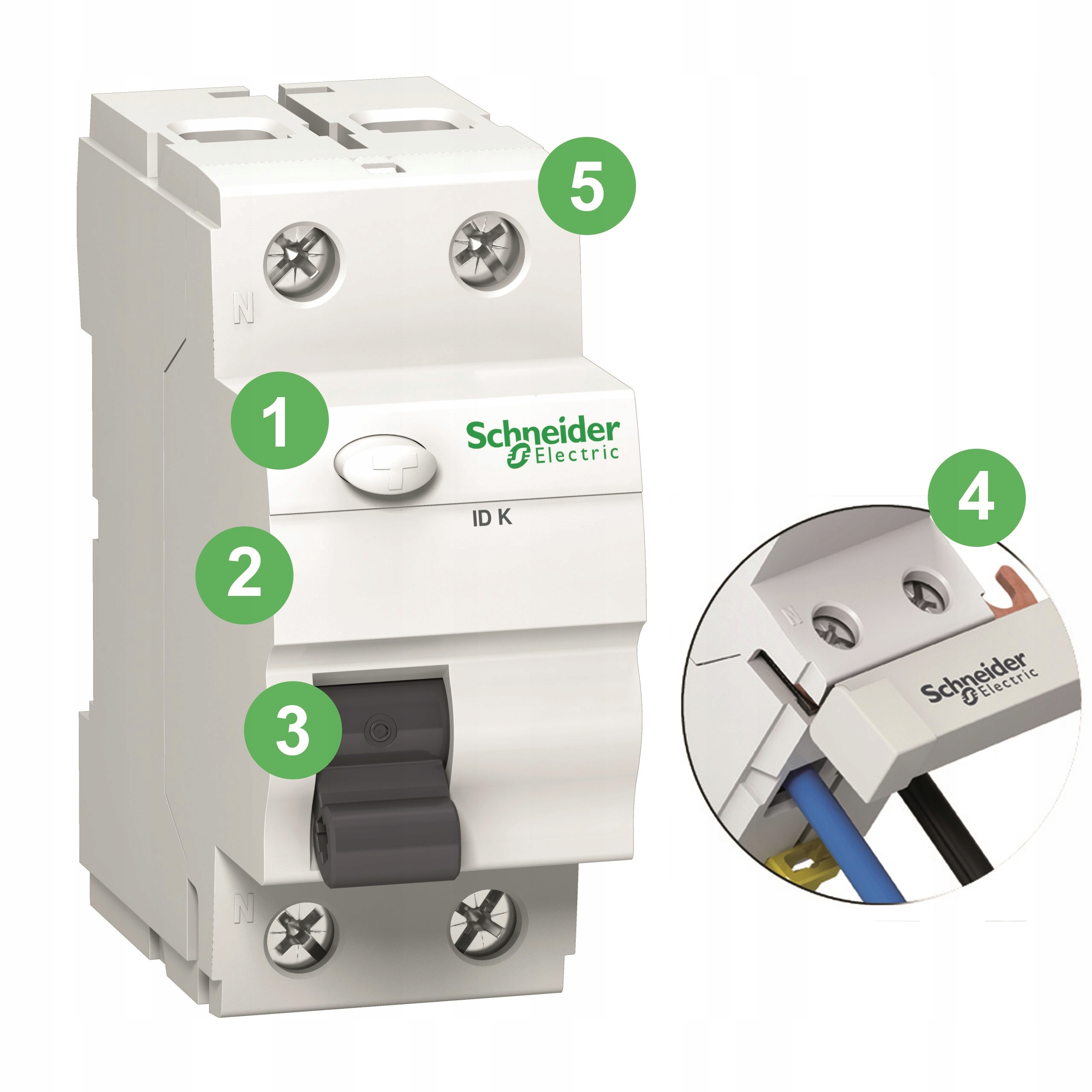 коректно реагує на синусоїдальні струми витоку. Це дозволяє захистити електроустановки від ураження електричним струмом. Автоматичний вимикач диференціального струму, призначений для потреб житлового та подібного будівництва. Подвійні клеми знизу (рейка + кабель). Гофровані клеми підвищують надійність з'єднання. Можливість перевірити правильність роботи кнопки управління «Т» лише раз на рік, протягом перших 7 років використання. Доріжка N розташована з лівого боку, що полегшує встановлення шин із автоматичними вимикачами.