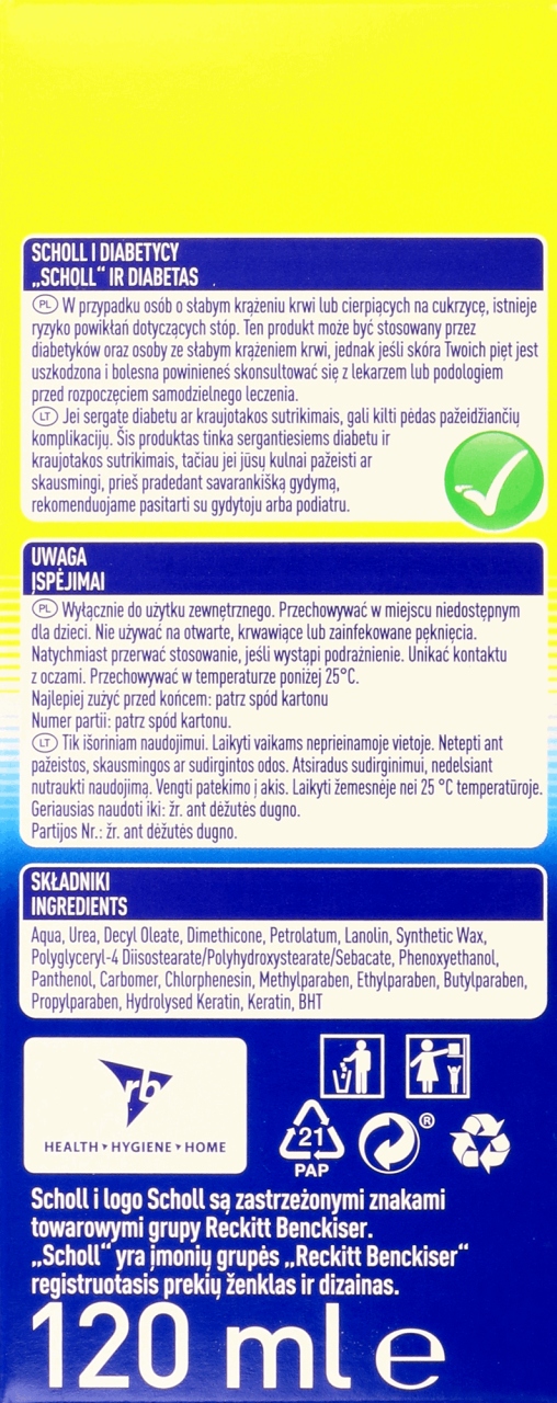 Відновлюючий крем від тріщин на п'ятах Scholl має доведену клінічну дію. Містить інгредієнти, відомі своїми розгладжувальними властивостями та заспокоюють грубу, суху та потріскану шкіру п’ят.
