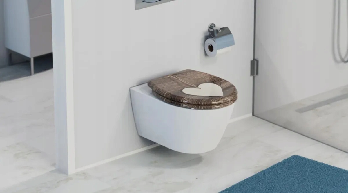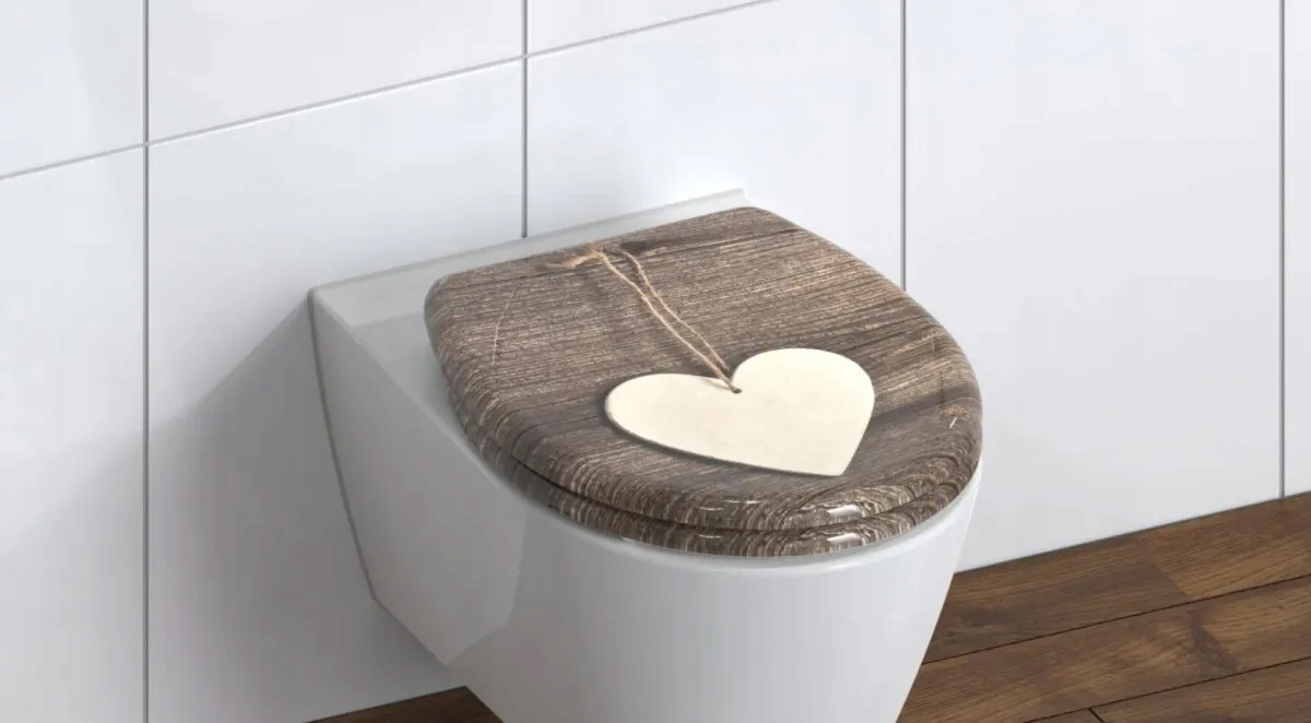 - Сидіння для унітазу WOOD HEART із дюропласту з плавним закриванням і механізмом швидкого зняття.