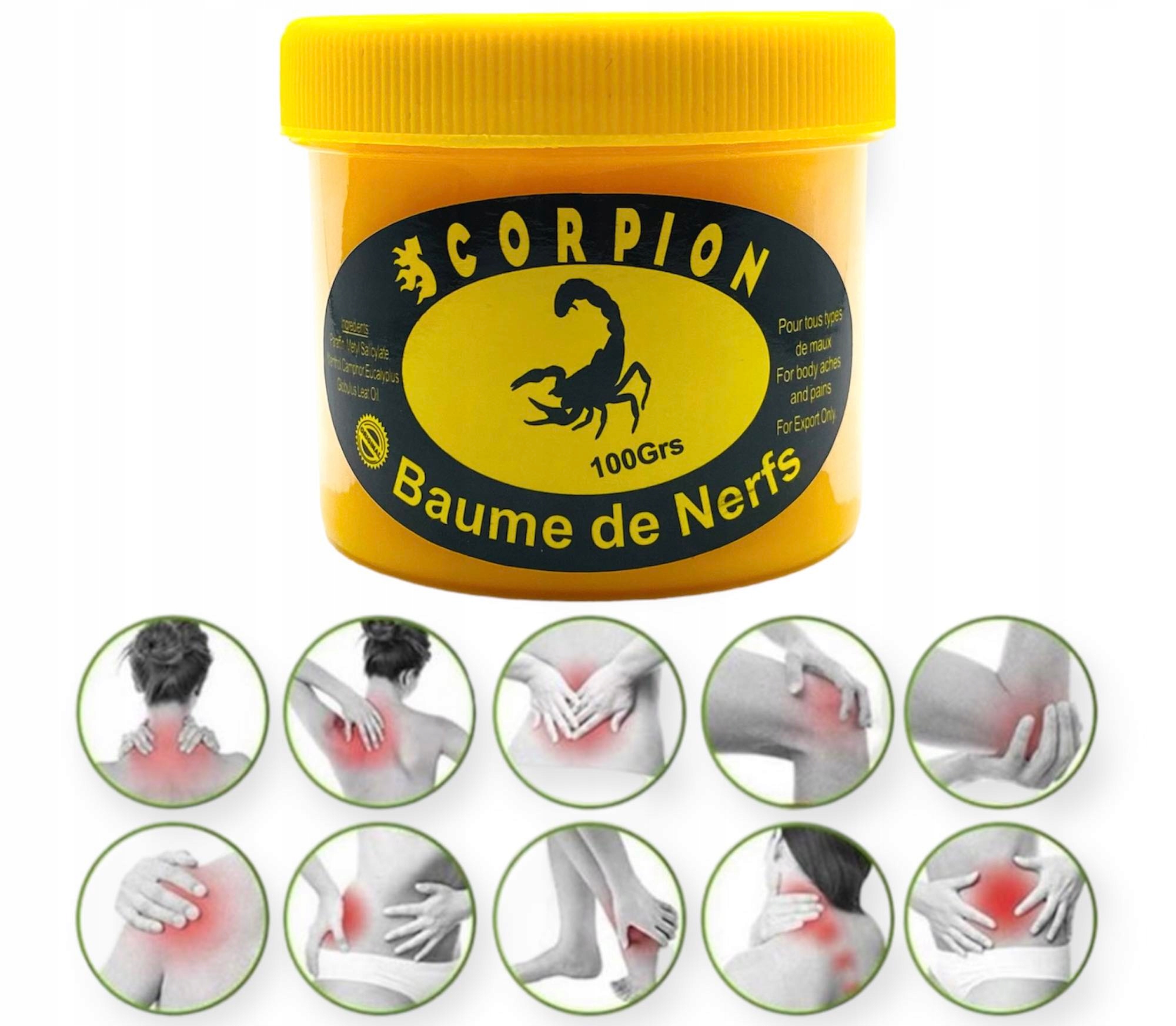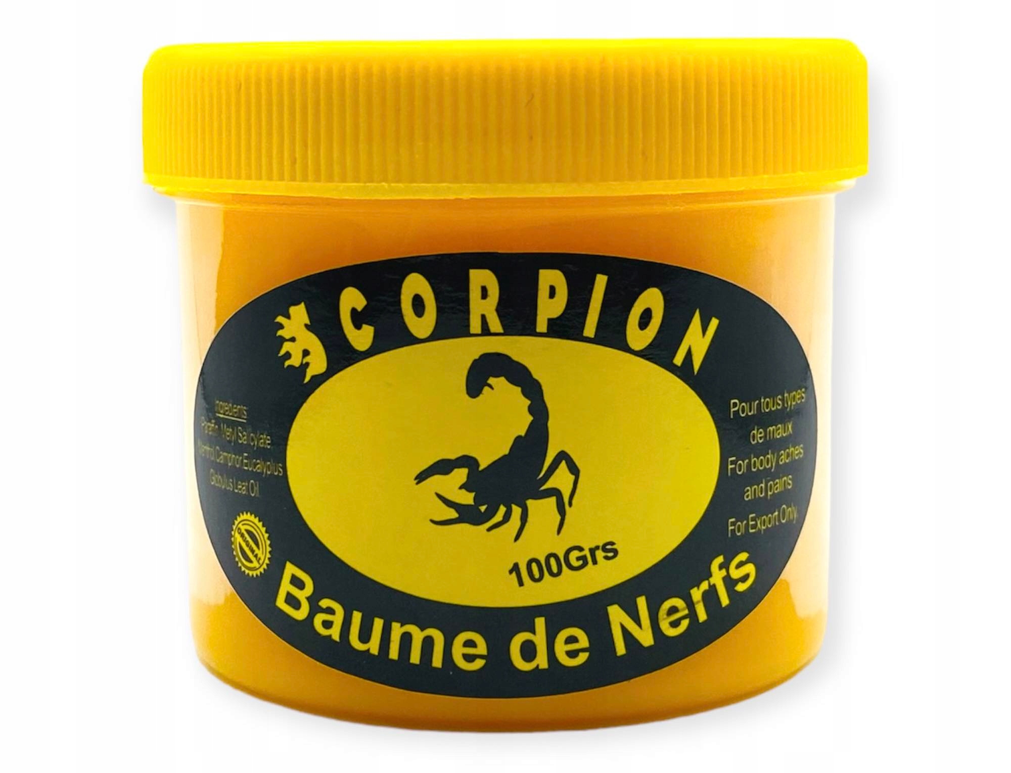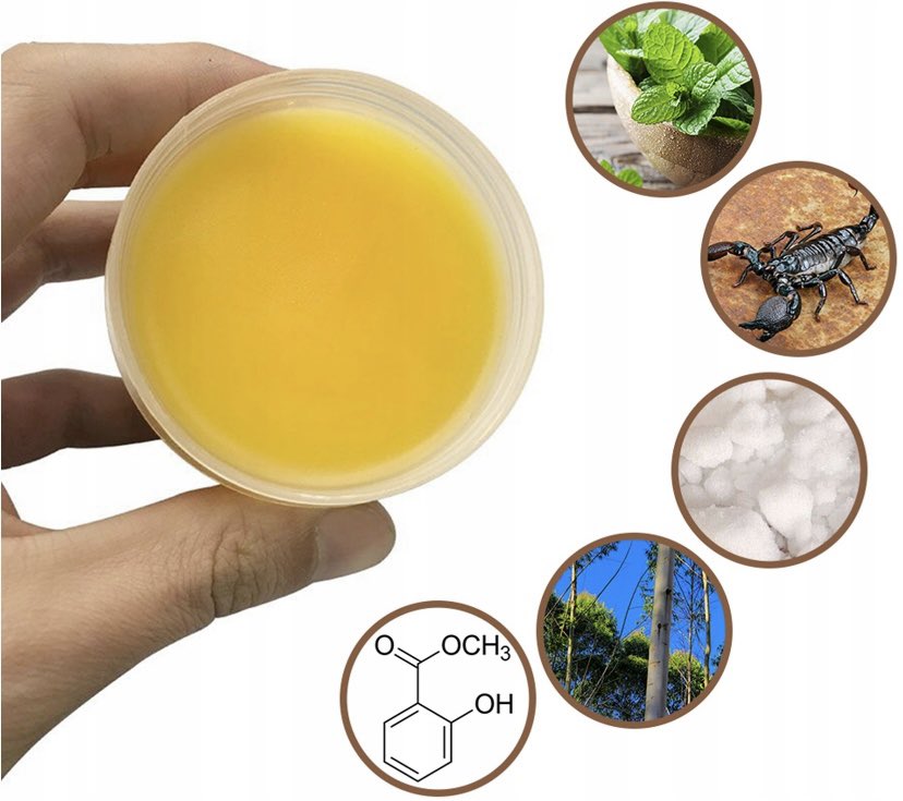 Цей бальзам містить справжній екстракт отрути скорпіона, відомий своїми болезаспокійливими властивостями. Ідеально підходить для людей, які страждають від м'язової втоми, ревматизму або болю в попереку. Також можна застосовувати при мігрені.