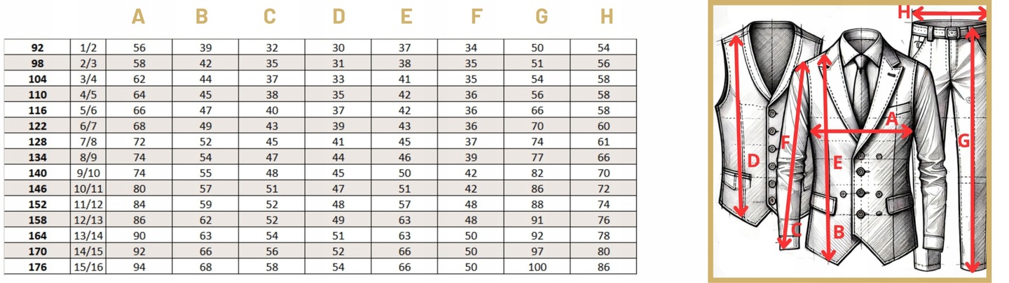 Вам не доведеться займатися одягом окремо. У наборі ви отримуєте: Елегантна куртка з атласним коміром, стильний жилет, біла сорочка, штани з налагодженням талії та муха . Все ідеально складено - просто надягайте, і воно готове!