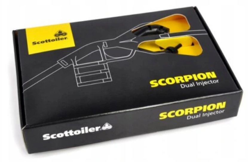 Подвійний інжектор Scorpion непомітний і простий у встановленні. На відміну від стандартного дозатора, він працює, розподіляючи масло одночасно на обидві сторони зірочки через унікальні подвійні насадки. Це точне нанесення забезпечує рівномірний розподіл масла з обох сторін ланцюга через зірочку. Використання цього рішення забезпечує ще чистіше нанесення, меншу витрату масла та більші інтервали між заправками.