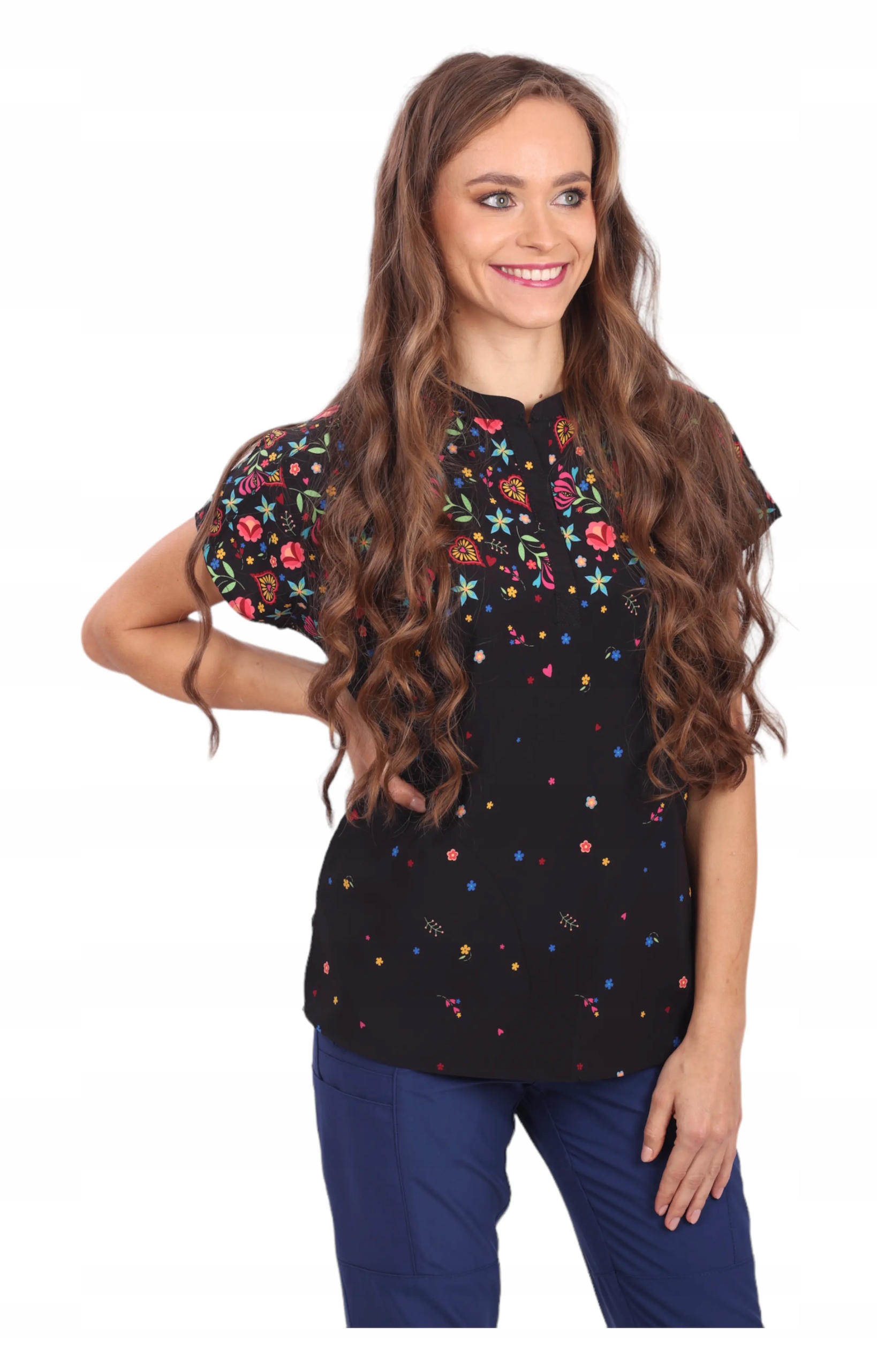 Елегантний чорний медичний світшот із привабливим візерунком Łowicz. Принт виготовлений з матеріалів найвищої якості. Повітряна тканина забезпечує оптимальний рівень вентиляції.