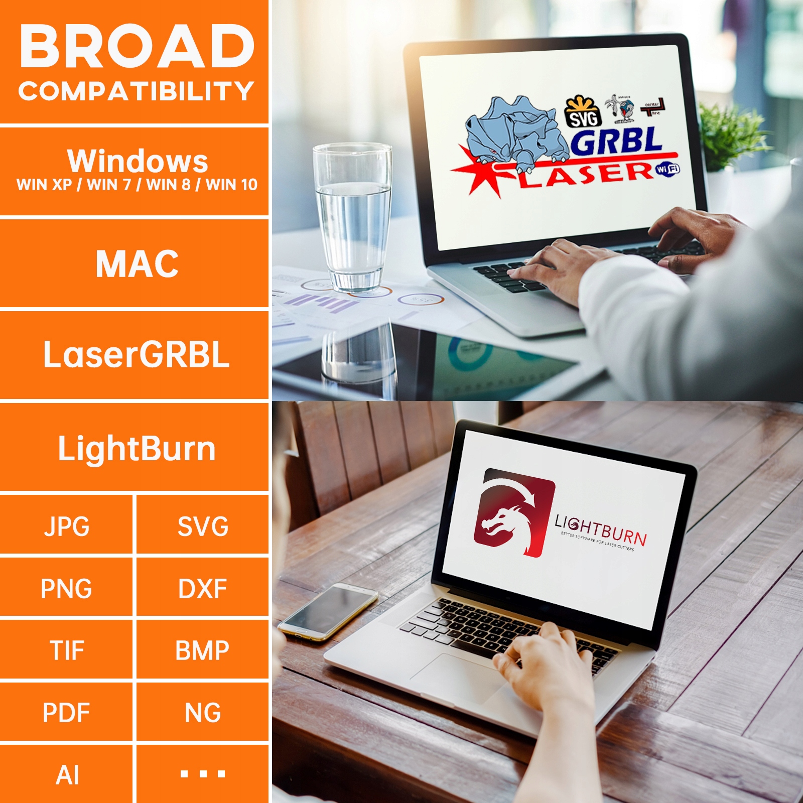 Програмне забезпечення: LaserGRBL, LightBurn, LaserGRBL, LightBurn, Benbox, GrblController, LiteFire, підтримує Windows, підтримує MAC. Підтримувані формати файлів NC, BMP, JPG, PNG, DXF та інші формати зображень.