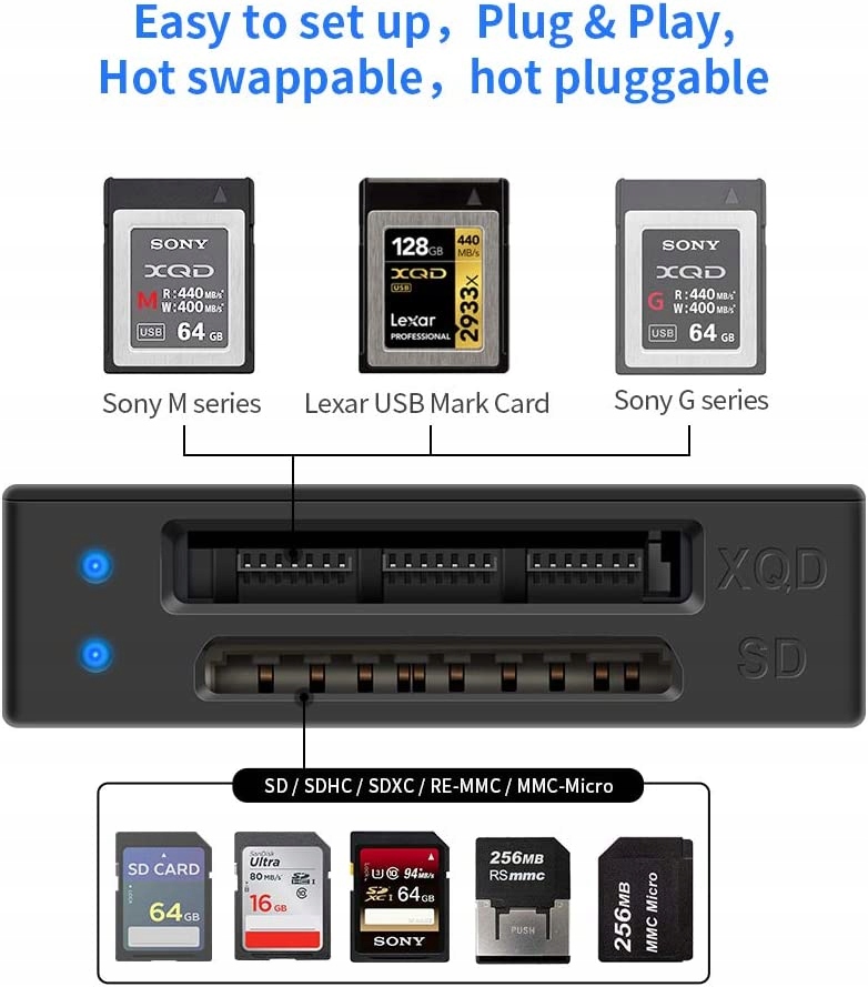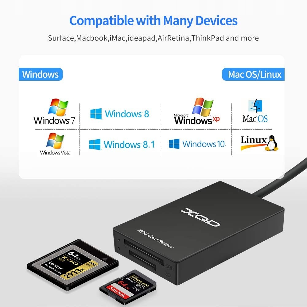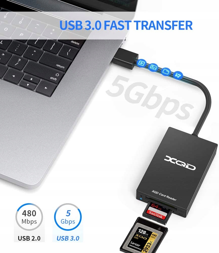 【Хороший компаньйон для вашого комп’ютера】 Пристрій для читання карток USB 3.0 може легко розширити слоти для карток пам’яті XQD і SD у вашому комп’ютері. Цей пристрій для зчитування карт пам’яті USB XQD SD підтримує карти пам’яті серії Sony G / Sony M / Lexar 2933x Lexar1400x Mark / серії Sony G / SDHC.