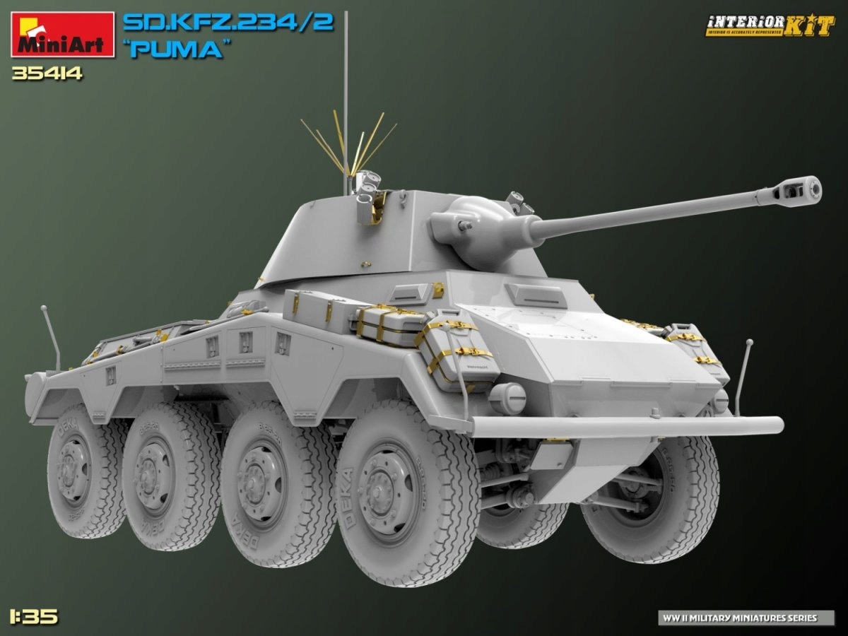 Пластикова модель Sd.Kfz.234/2 PUMA Interior Kit від MiniArt з каталожним номером 35414 в масштабі 1/35 — унікальний набір для любителів військової техніки часів Другої світової війни. Нижче ви знайдете детальну інформацію про цю модель.
