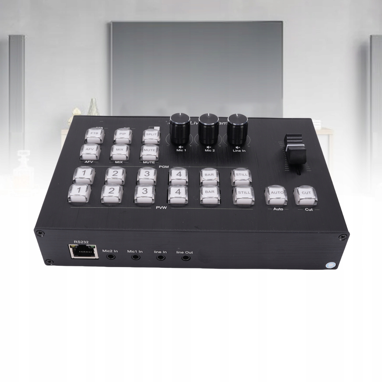 4. Параметри аудіовходу: за допомогою 3 незалежних 3,5-міліметрових стереоаудіовходів ви можете підключити настільний і накладний мікрофон, а також музичний плеєр, що дозволяє створювати попередньо нарізану вступну музику під час прямих трансляцій
