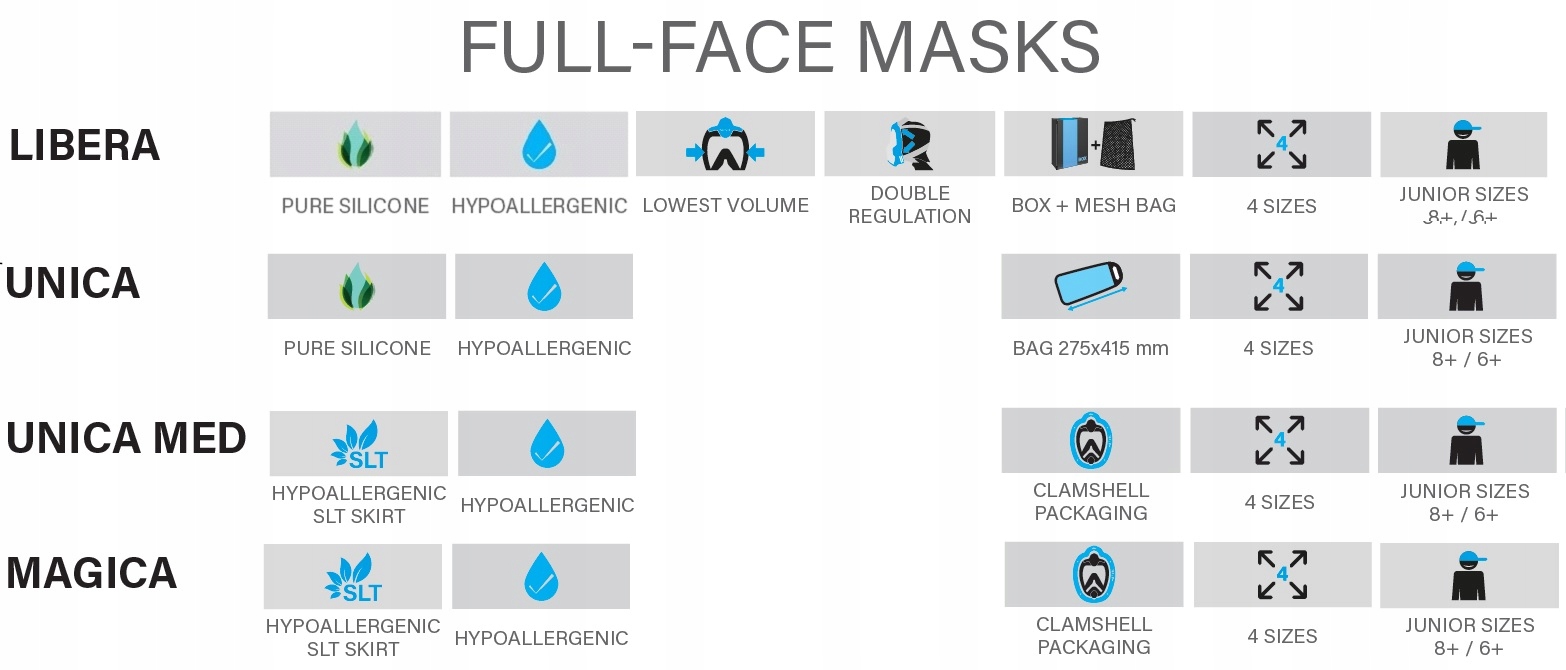 Маска Unica Seac Unica доступна в таких кольорах та розмірах: