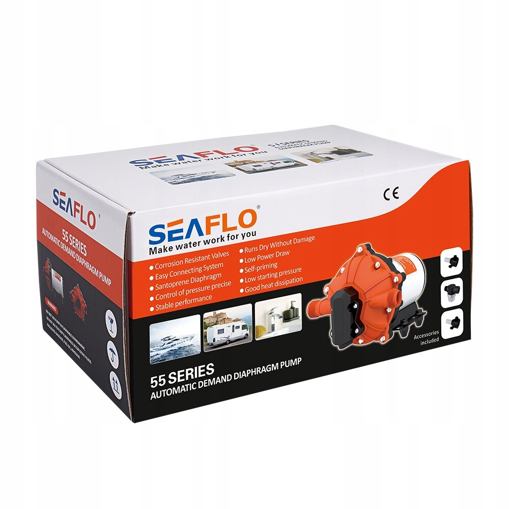 водяний насос 12В 18,9 л/хв. Він забезпечує великий потік води зі зниженими циклічними насосами завдяки великій п’яти -хамерній мембрані. Ці моделі призначені для роботи у водних системах без необхідності накопичувального резервуара та п'яти пристроїв! Він також підходить для використання з водопровідною системою у фекальному резервуарі, який можна знайти на човні, в будинку або в далекій кабіні. Забезпечує до 18,9 л на хвилину. Насоси серії 55 є самостійними і можуть працювати без пошкоджень, надійної дії та низького струму. Цей автоматичний водяний насос має вбудований перемикач тиску, який автоматично запускає і зупиняє насос, коли кран відкривається і закривається. Він використовується в системах встановлення води на яхтах, в кемпінгових причепах, у зрошенні, в сонячних водних системах та в промисловості.
