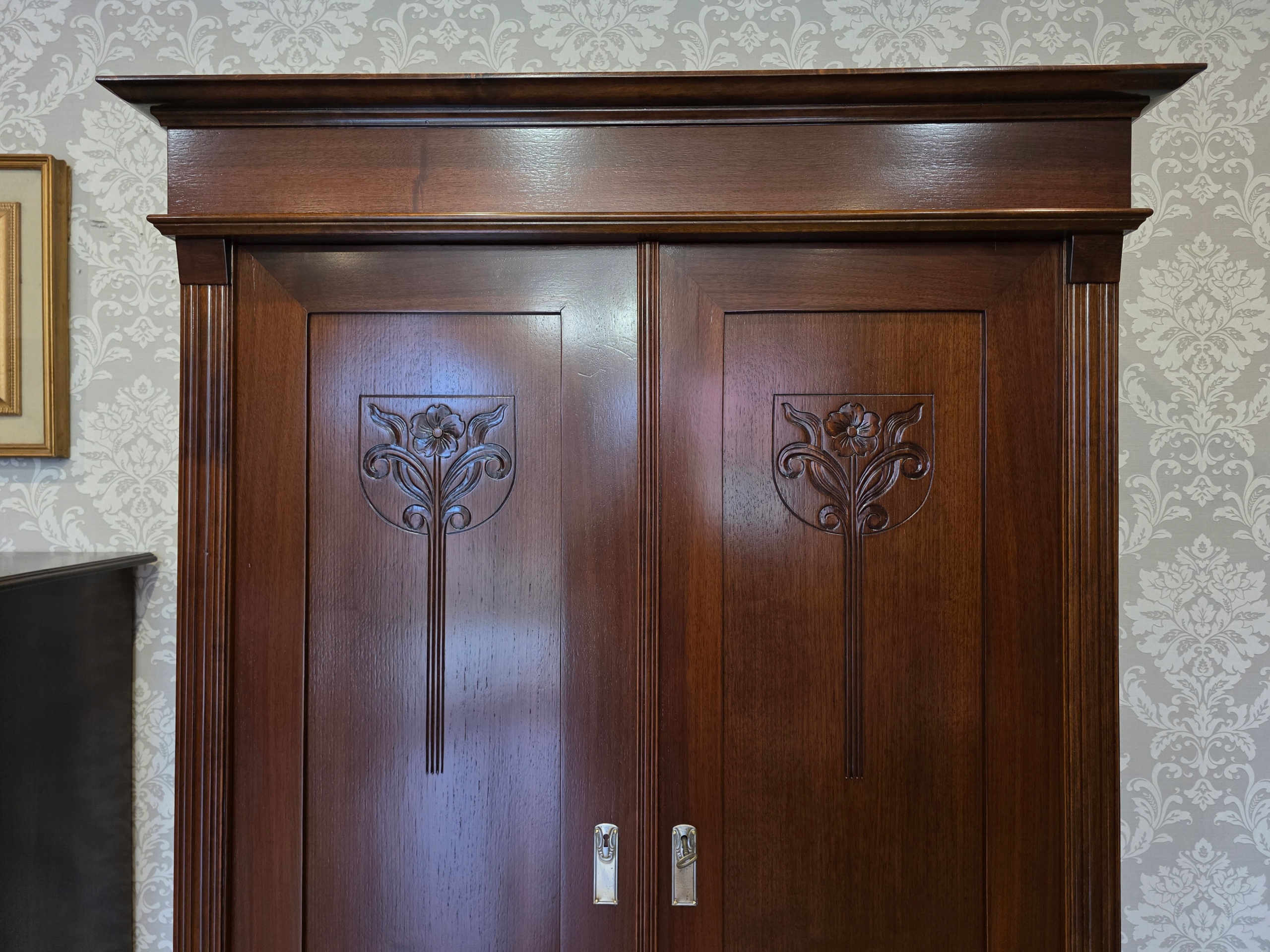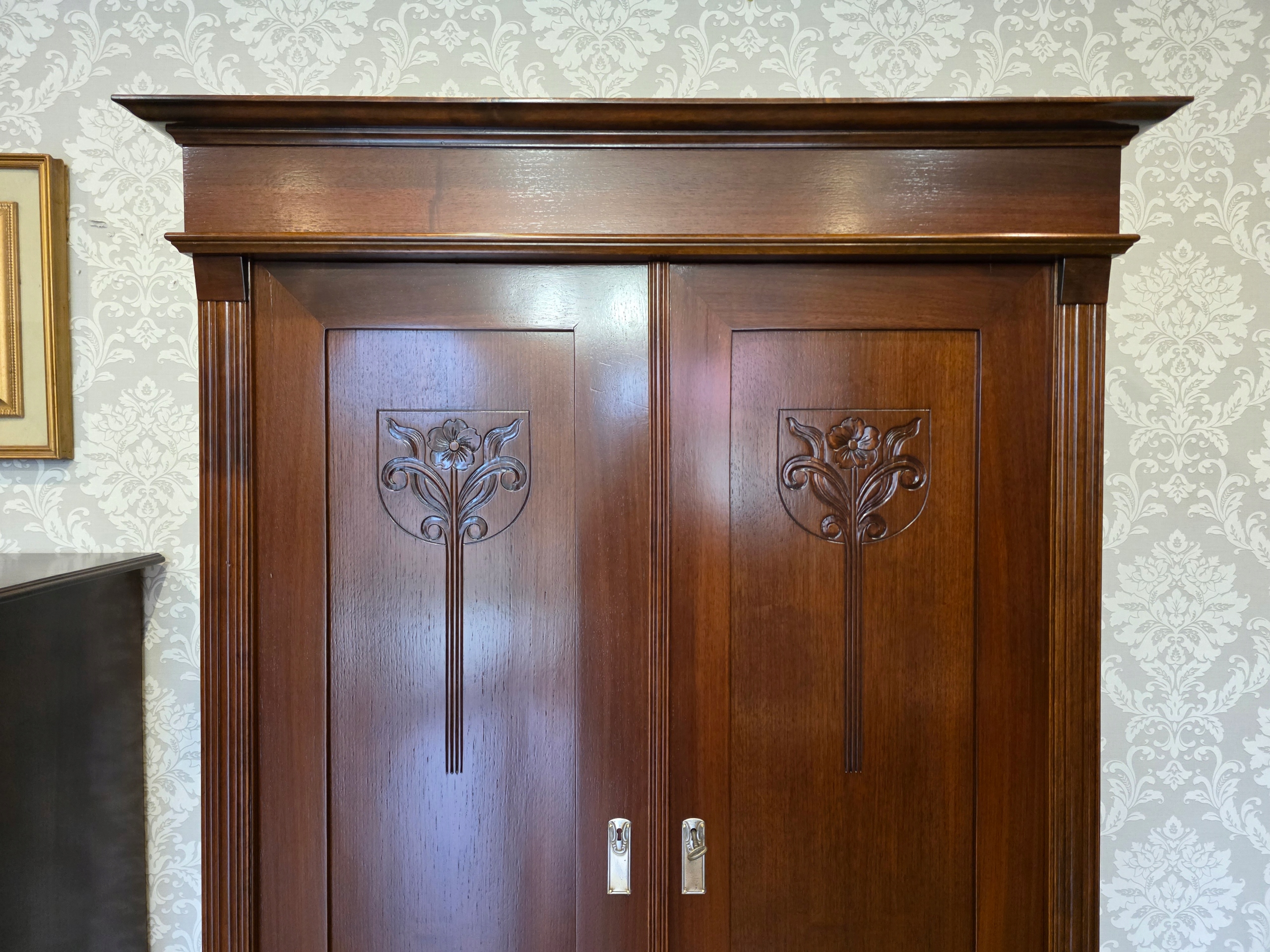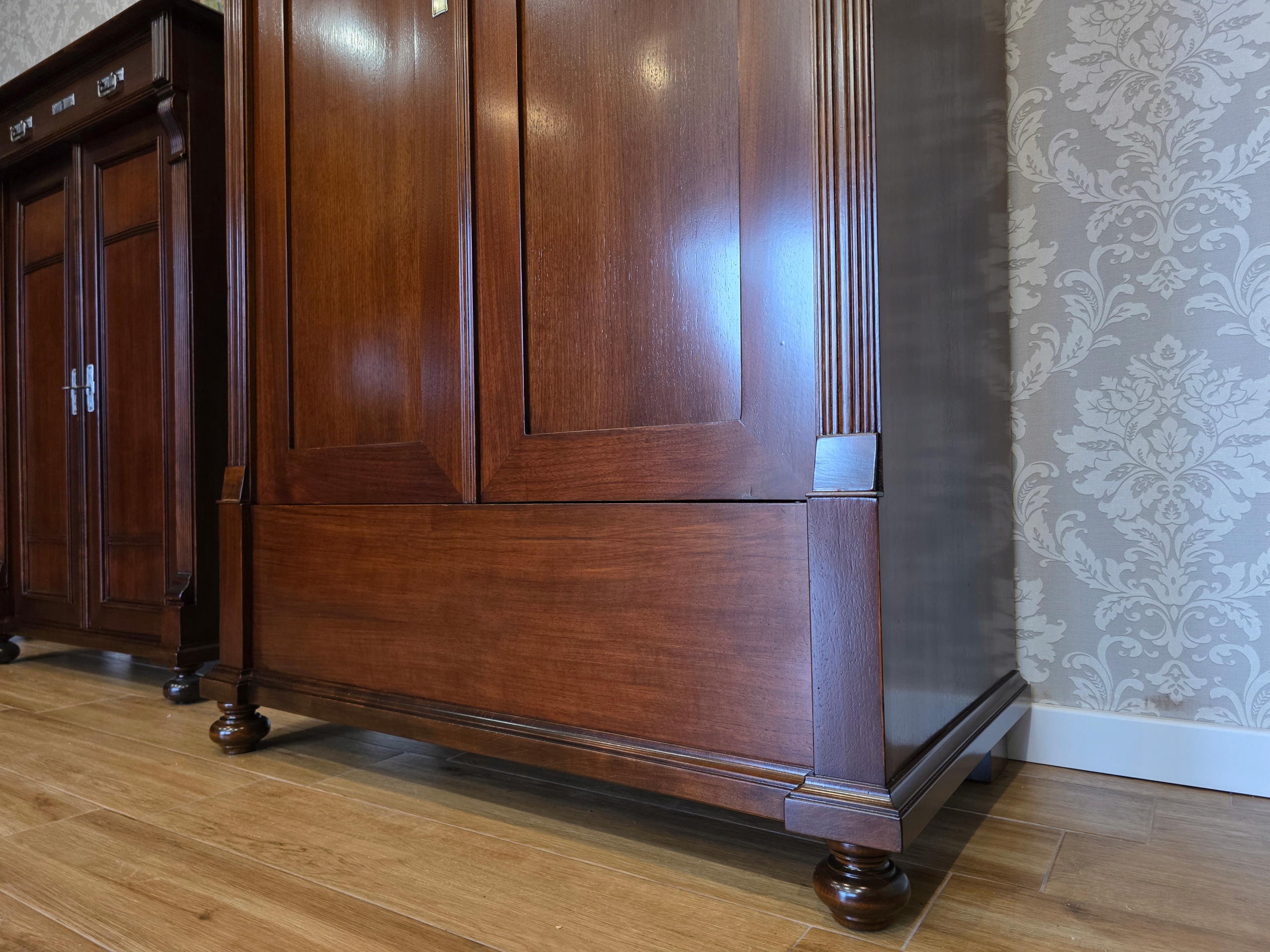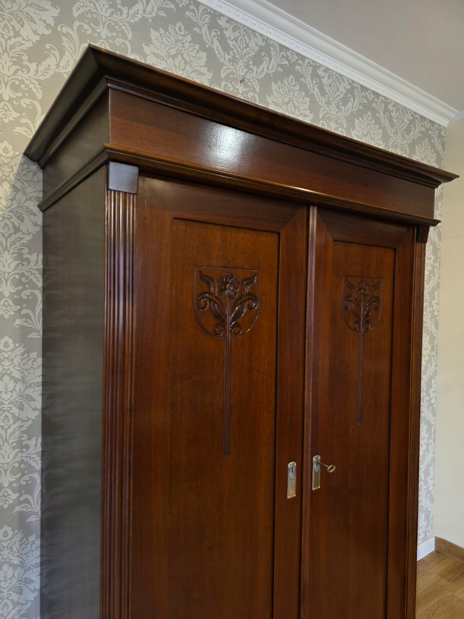 Меблі мають характерні деталі в стилі модерн, облицьовані шпоном волоського горіха, морений горіх, глянцевий сатин.