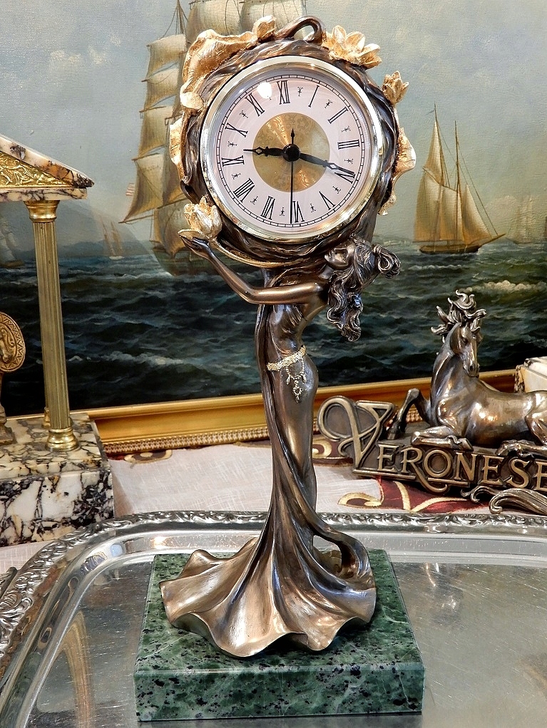 Запрошую вас придбати чудовий годинник в обіймах красивої, стрункої жінки, в стилі, що відсилає до класичного модерну. На природі цей предмет виглядає набагато краще. Бренд Veronese гарантує якість та зовнішній вигляд . Весь виріб виготовлений з конгломерату мінералів і смол (полірезин), покритий латунню, розписаний вручну.Ваша самовіддача значно підвищить привабливість годинника, може стати чудовою ідеєю для оригінального подарунка.