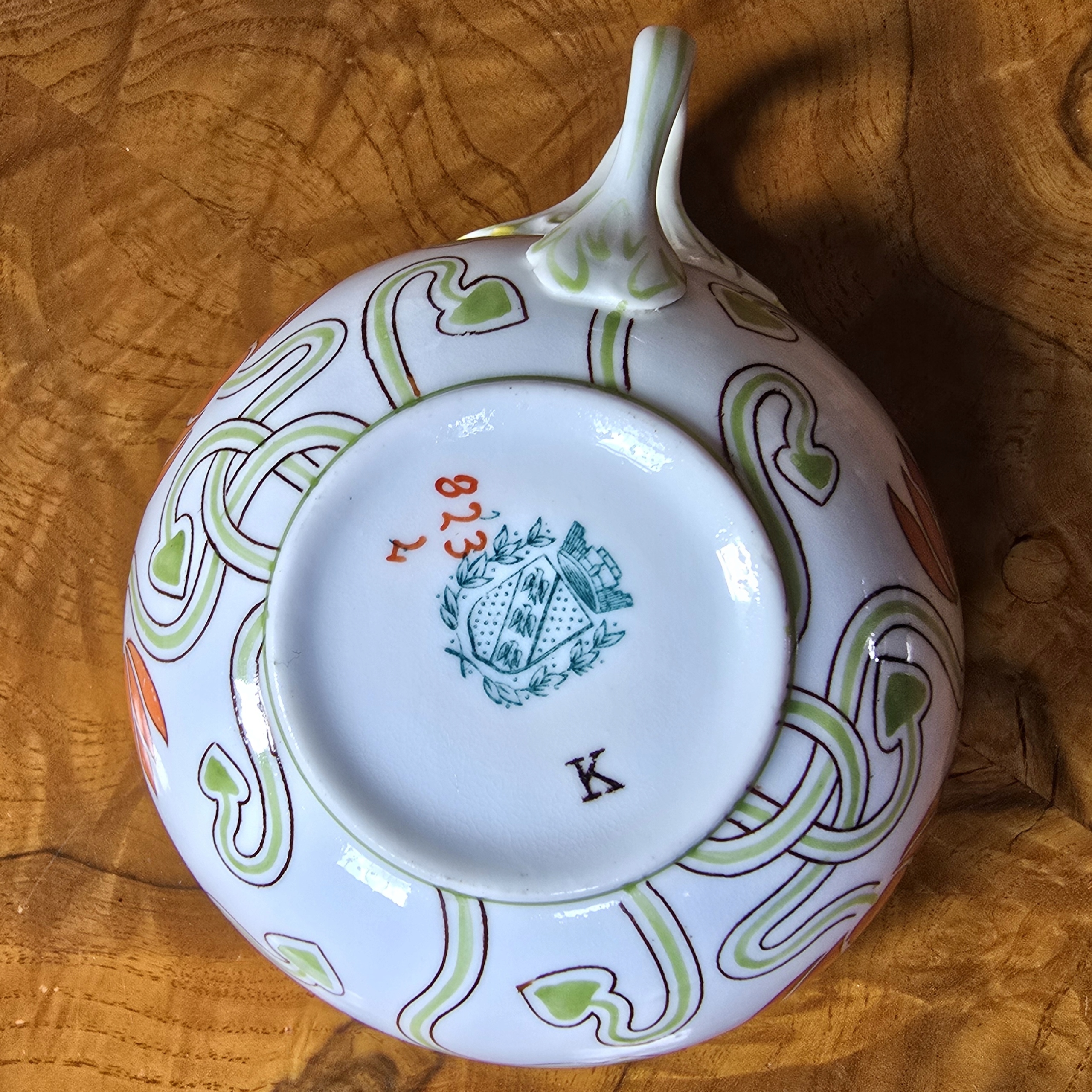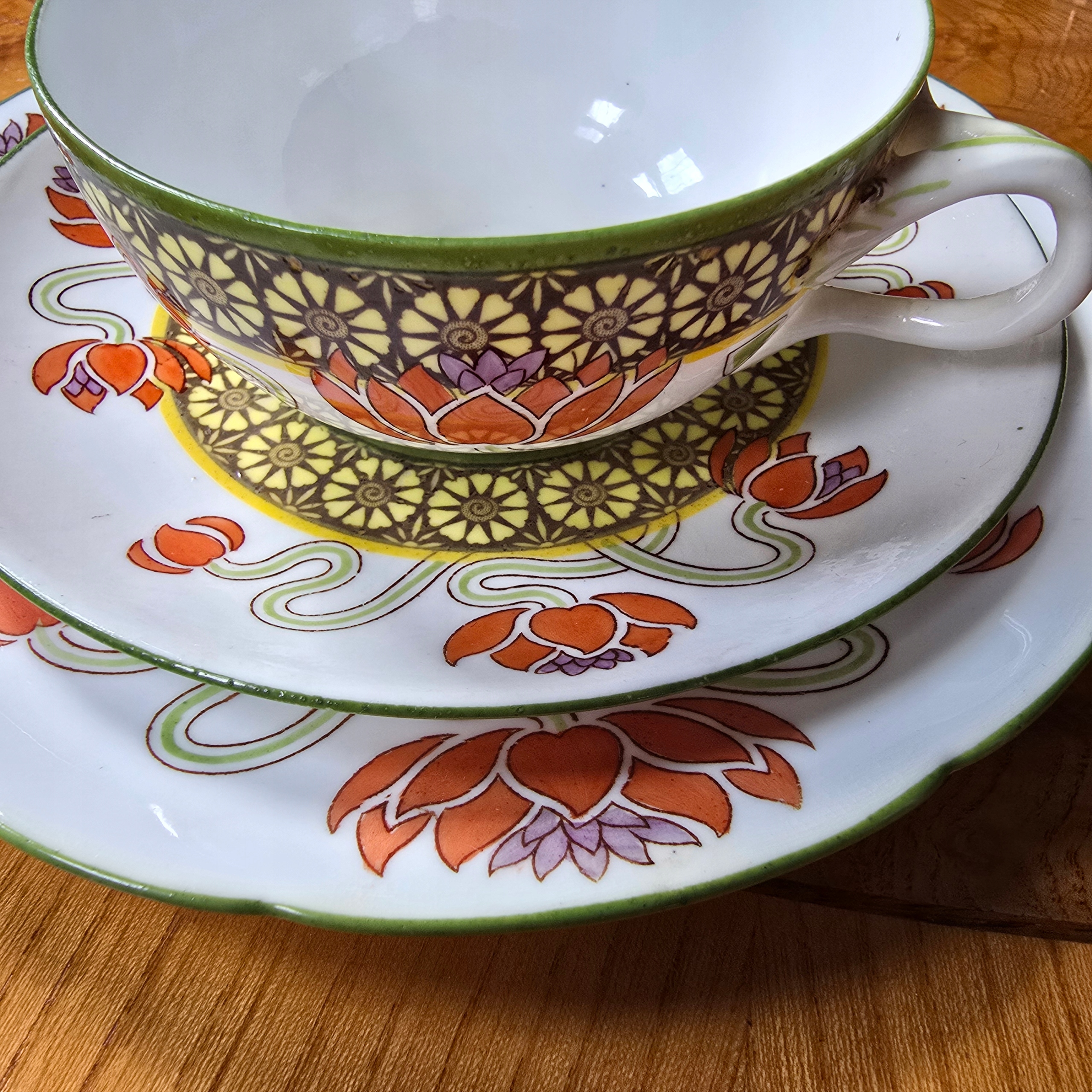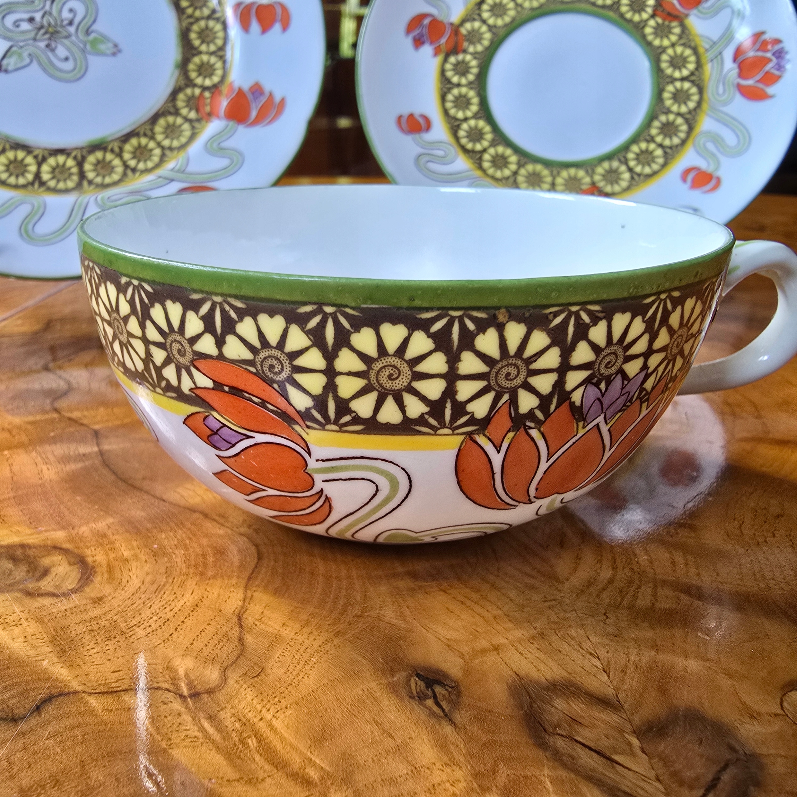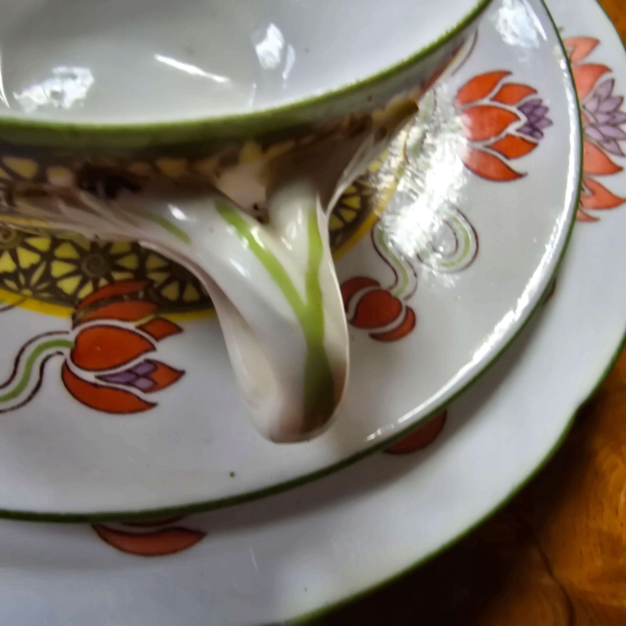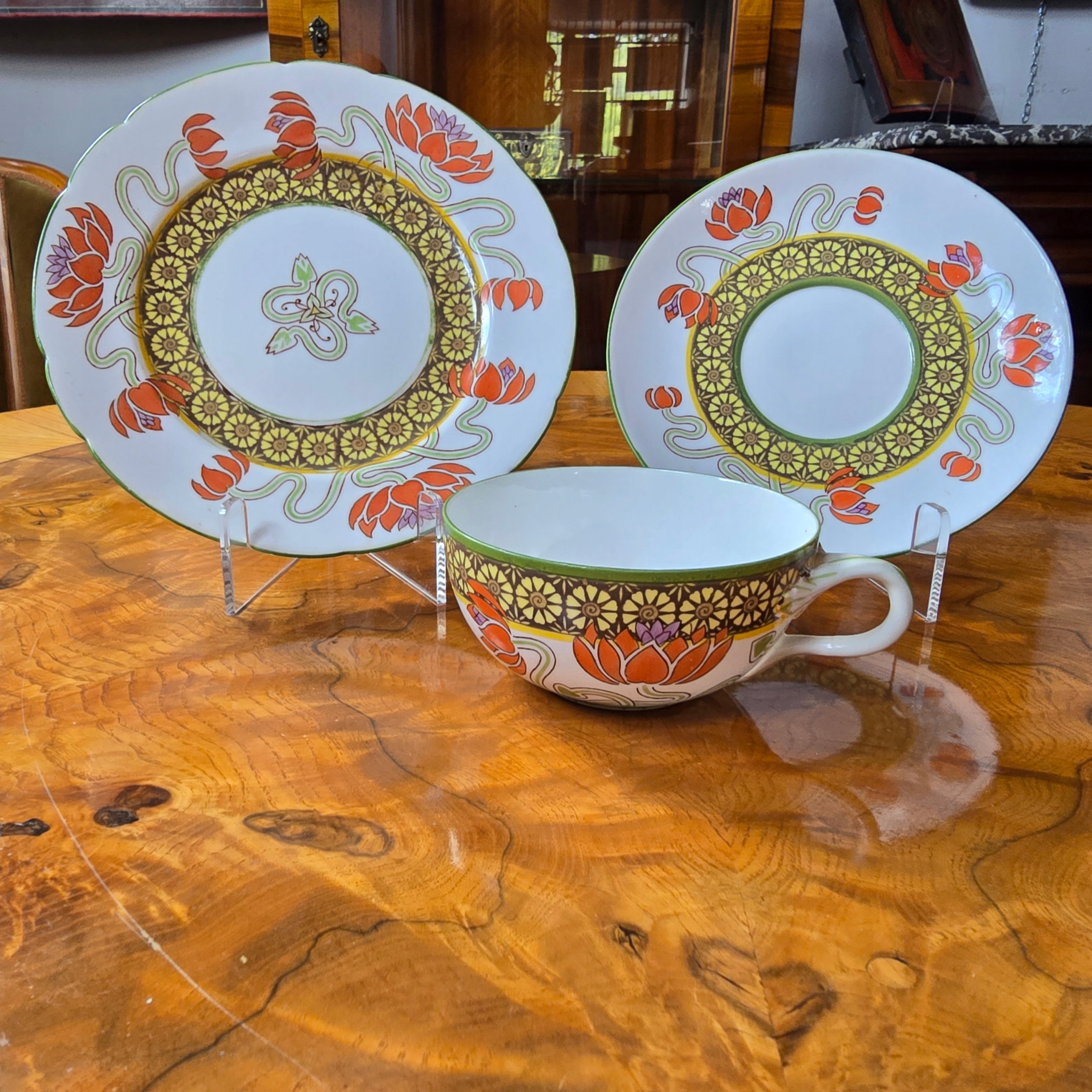 Прекрасний набір сніданку з арт -модерн французької компанії Sarrequemines. Підпис предметів з 1860 - 1919 рр. Діаметр чашки 9,5 см, тарілка 14,5 см, тарілка більше 18,5 см. Дуже хороший стан без порожнин, ударів, тріщин. Легкі потертості на більшому теларіторі.