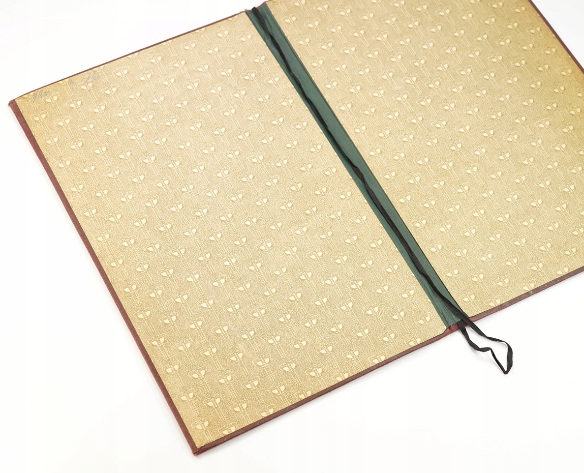 Оригінальна, надзвичайно красива, довоєнний модерн, ручна декоративна жорстка папка для документів, оздоблена тканиною з позолотою, всередині оригінальний паперовий форзац того часу, декорований; розмір: 22 х 35 см, хороший + візуальний стан, місцями помітні незначні зміни кольору. Рекомендую, оригінальна, рідкісна річ за доступною ціною. Надзвичайно цікавий рідкісний оригінальний предмет. Стан добре видно на фото в описі аукціону.
