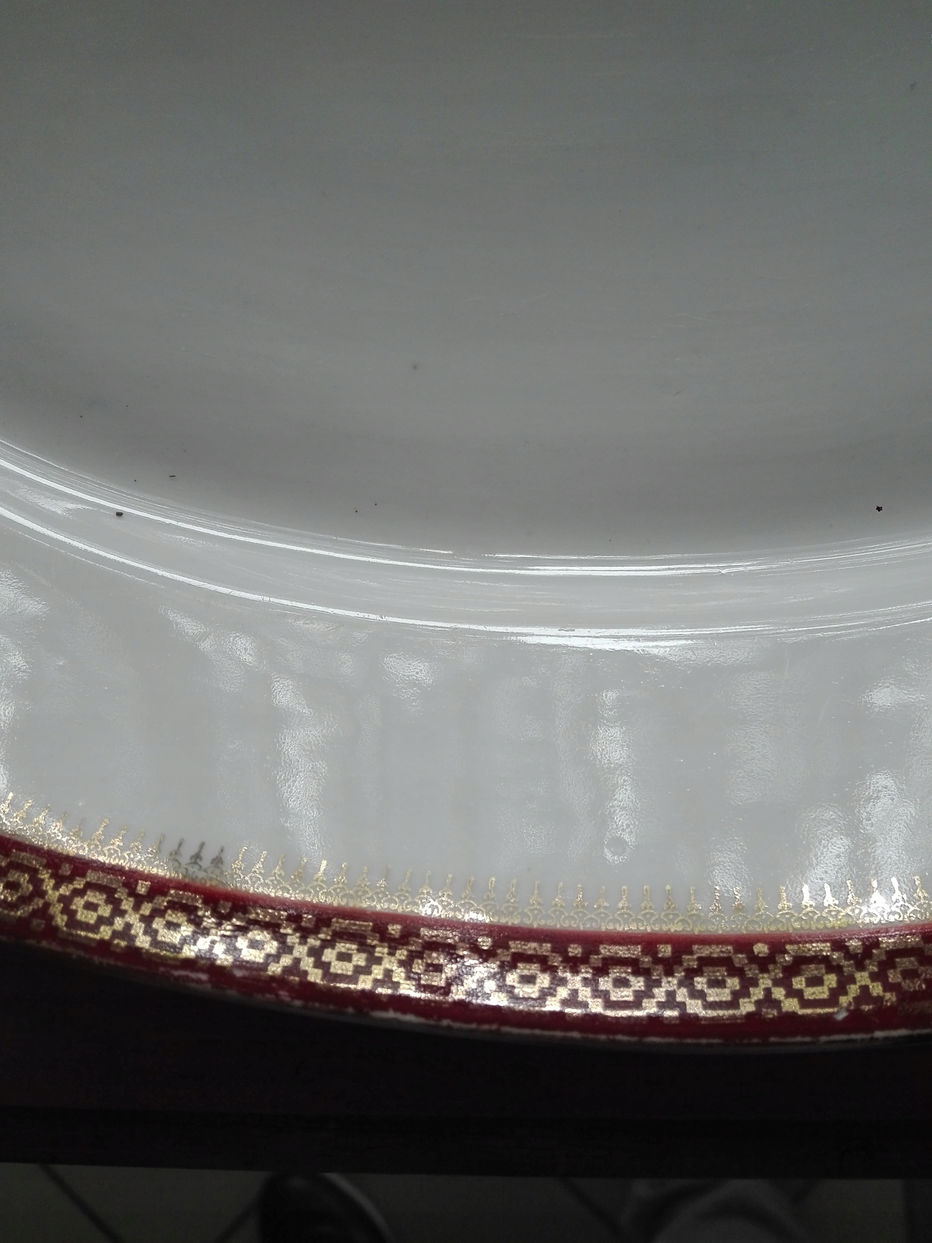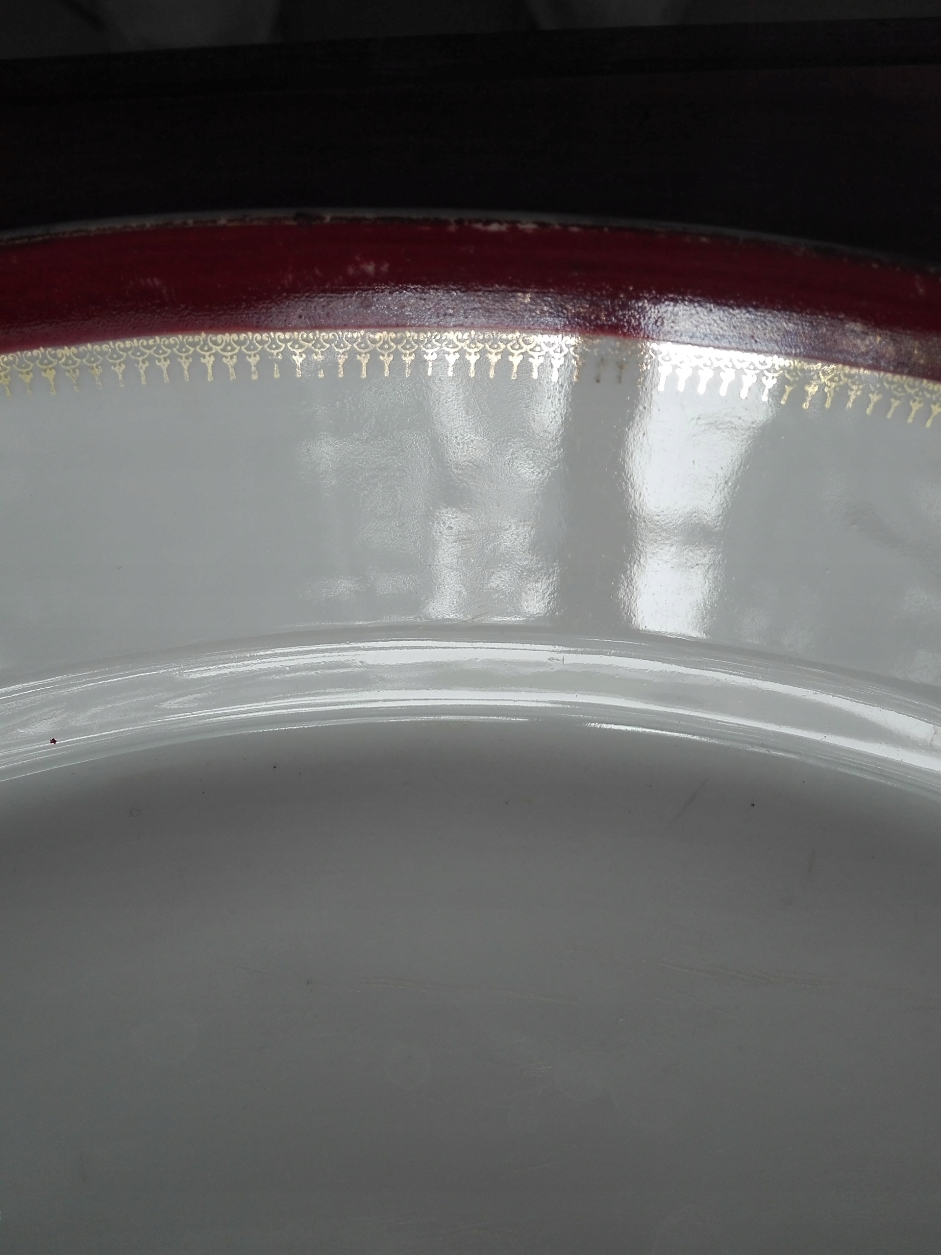 - На краї прикрашені карміново-вишневою смугою. Золотий декор, нанесений на смуги.