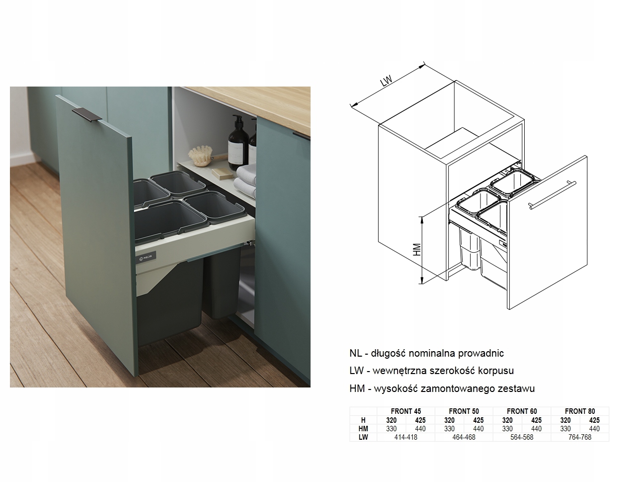 Сортувальник сміття від польського виробника меблевої фурнітури REJS. Він походить від лінії SEGREGO і являє собою різновид висувної шухляди з 2 кошиками та переднім кріпленням (передня частина шафи кріпиться до кошика та висувається подібно до вантажних кошиків). Кошик працює на напрямних повного висунення з вбудованим механізмом затягування та гальмом (кошик закривається м'яко - без хлопків). Крім того, в лінійці SEGREGO напрямні додатково захищені від бруду, що особливо важливо в сміттєвих баках, оскільки це гарантує тривалу роботу. Це більш низький варіант, який може (в залежності від типу сифона) встановлюватися в тумби з раковиною. Підшивка має 2 ємності по 15 літрів і кріпиться до боків шафи. Навантаження до 25 кілограм. Кришка кошика виготовлена з листового металу товщиною 1 мм і може використовуватися як додаткова полиця.