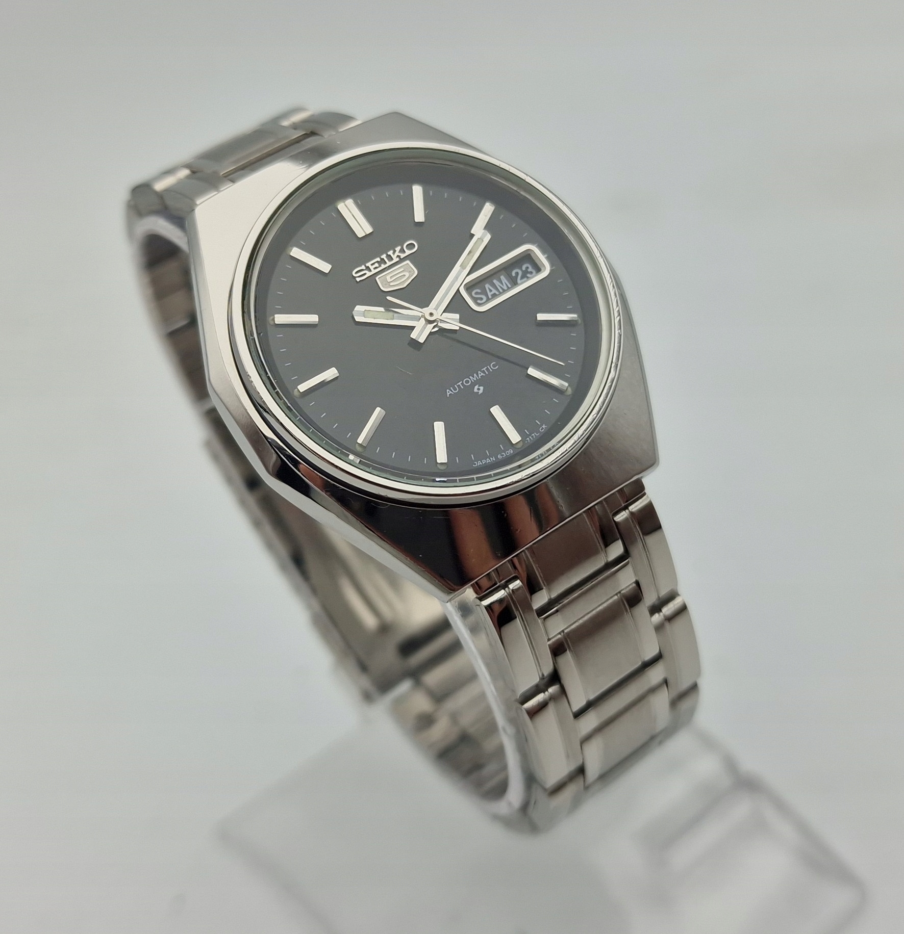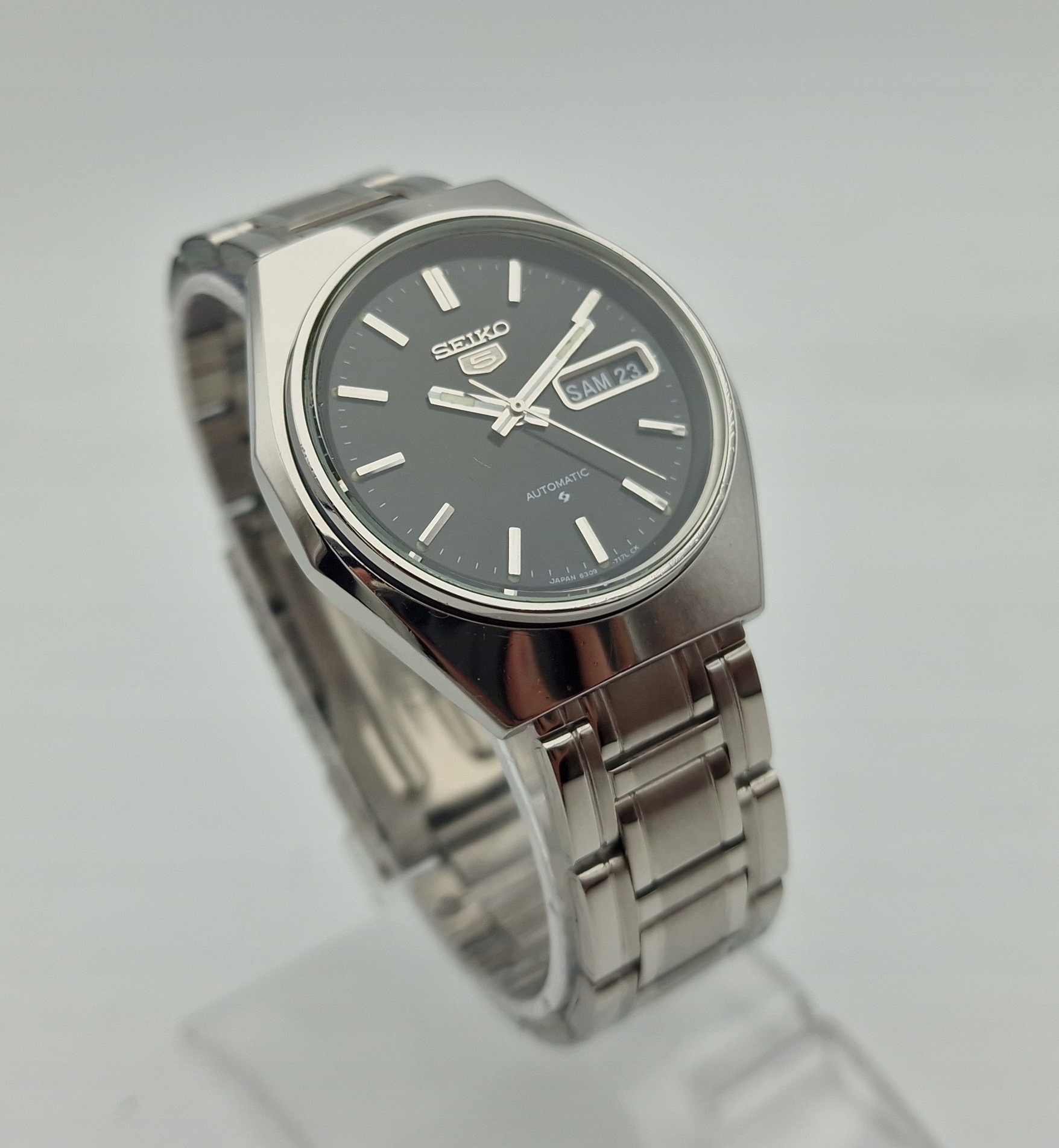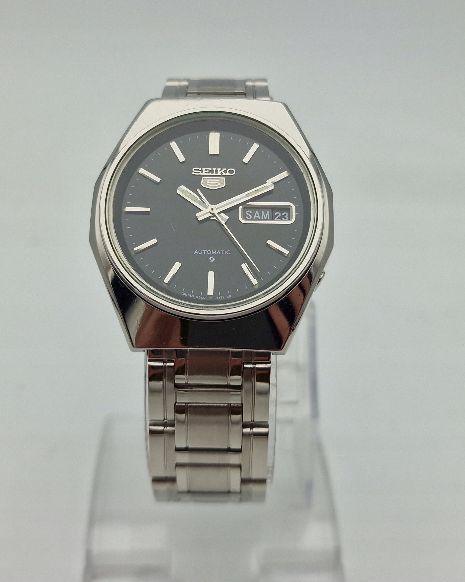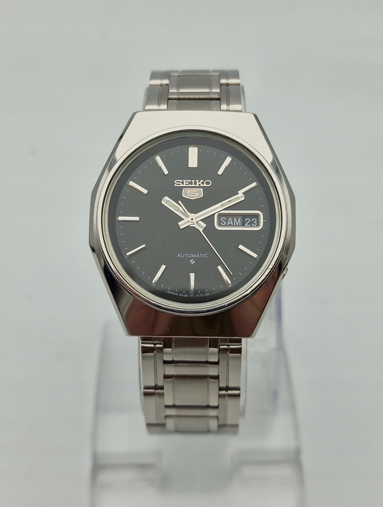 - Чорний металевий циферблат із відображенням дати на 3 годині. Циферблат підписаний: «SEIKO 5, AUTOMATIC, JAPAN». Циферблат майже в ідеальному стані, як показано на фотографіях з аукціону.