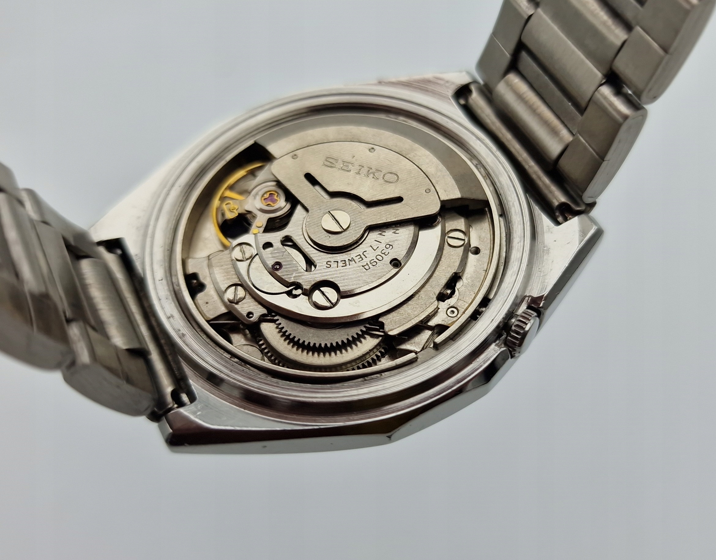 - Механізм годинника з автоматичним заводом (заводиться сам під час носіння) на 17 коштовних каменях із анкерним спуском, підписаний: «SEIKO 6309A, SEVENTEEN 17 JEWELS, JAPAN» і в хорошому робочому стані після огляду та обслуговування годинникар , у відмінному стані.