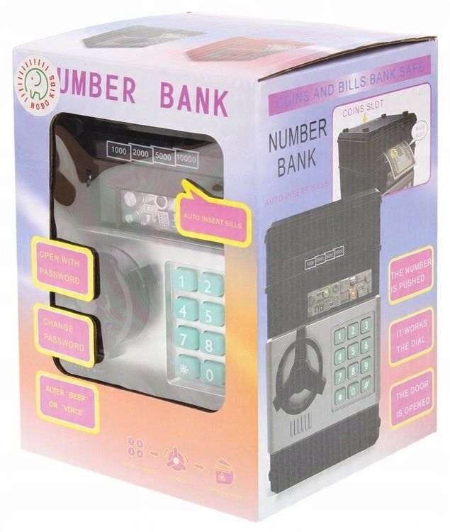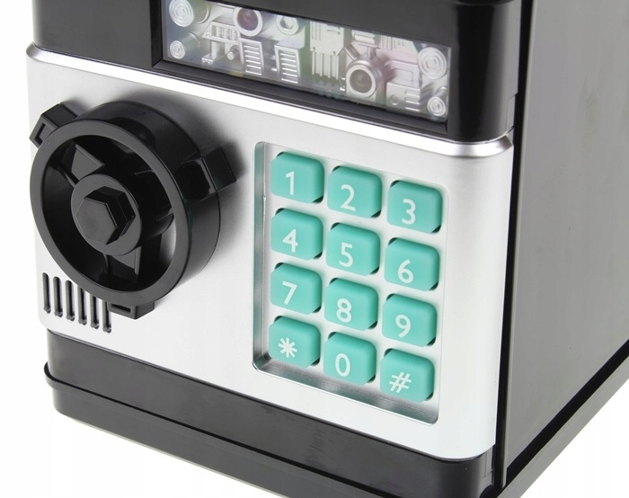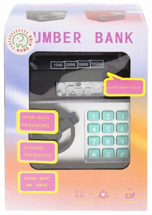 Сейф є дуже привабливою альтернативою традиційній скарбничці. У нього можна розміщувати як банкноти, так і монети, а при необхідності їх витягувати, ввівши відповідний код. У верхній частині сейфа є спеціальний отвір для вставлення монет. Відповідне місце для банкнот знаходиться на передніх дверцятах сейфа, над зображенням, що імітує паперові гроші. Вставте банкноту в отвір, зелений індикатор почне блимати, монета автоматично втягнеться всередину відділення. Якщо горить червоне світло і банкнота застрягла, відкрийте сейф і вийміть його. Скарбничка захищена спеціальним чотиризначним кодом, який ви можете призначити самостійно. Сейф має світлові та звукові ефекти. У відділенні на дверцятах сейфа є перемикач, який дозволяє змінити характерний звуковий сигнал на англійський голос.