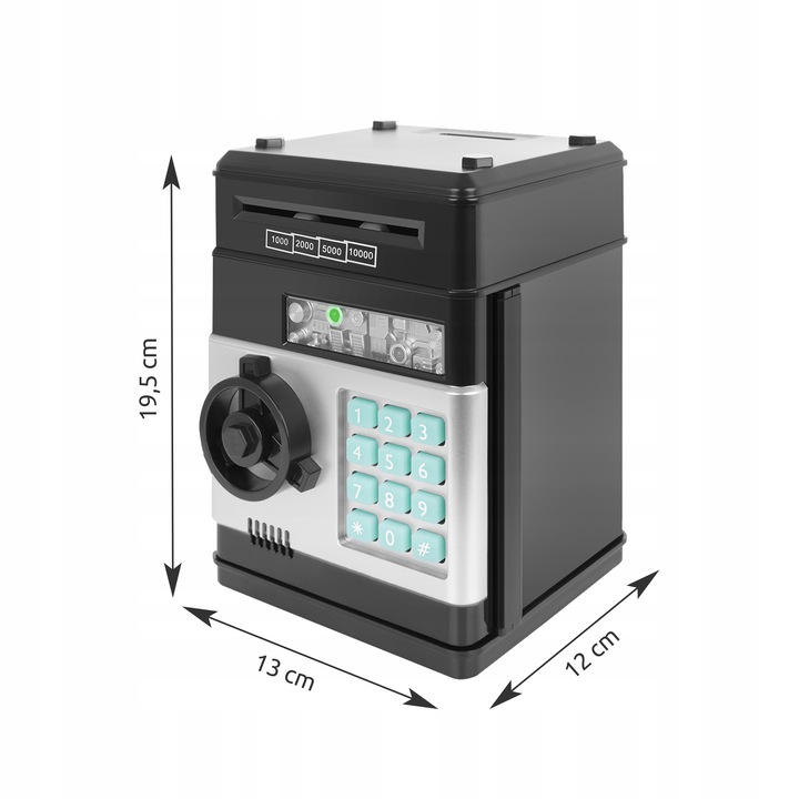 - СПЕЦИФІКАЦІЯ – двері відкриваються після введення 4-значного PIN-коду; можливість введення власного пароля; для банкнот і монет; вік дитини 6+; вміння змінювати звуки вголос; через 20 секунд сейф нагадує, що двері відкриті; розміри (висота/ширина/глибина): 19,5/13/12 см; вага: 0,55 кг; вага в упаковці: 0,67 кг.