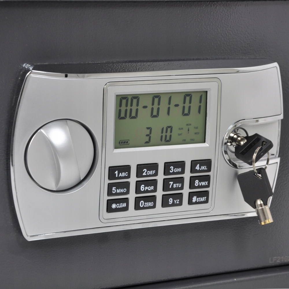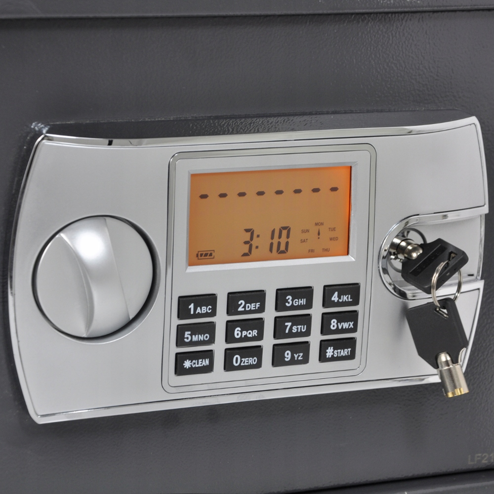 - Сейф оснащений цифровим замком, аварійним циліндровим замком,
