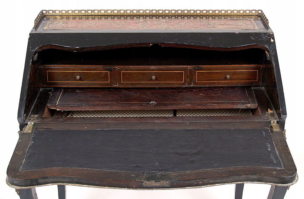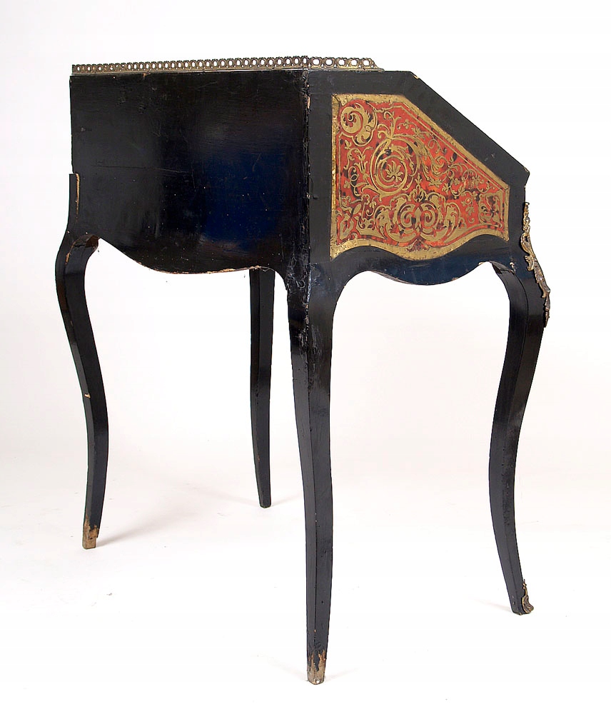 з хвилястими лініями рами, спирається на чотири кутові та кабріольні ніжки, закриті косим клапаном. Верхня плита з трьох сторін оточена латунною ажурною галереєю. Клапан хвилясто вирізаний у верхній частині й оточений латунною смугою. Прикрашений латунним листом з гравіюванням і черепаховою маркетрі. На ніжках аплікації з позолоченої бронзи. Під клапаном знаходяться три висувні ящики, полиця і висувний верх.