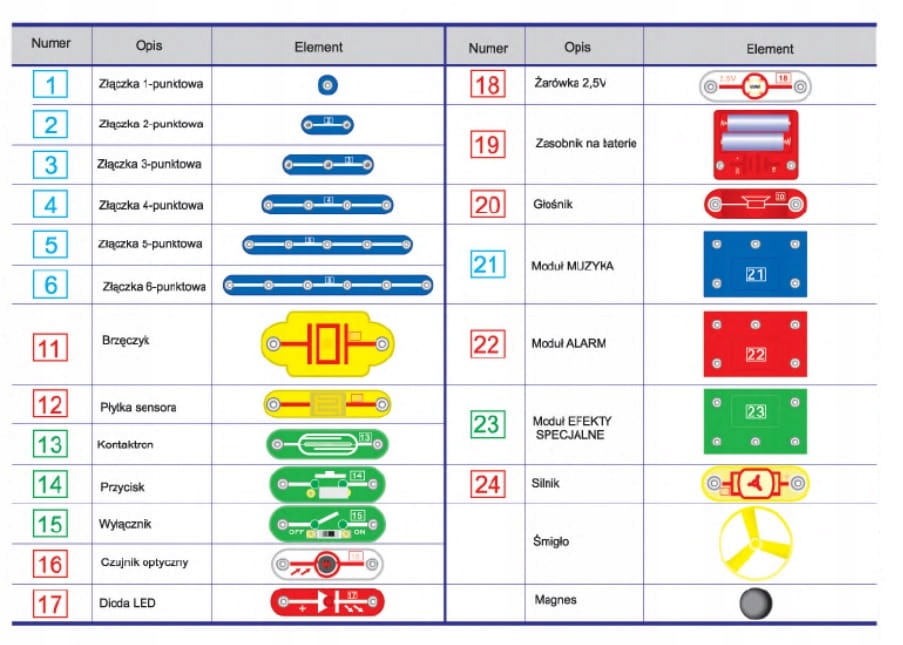 Грунтуючись на докладних інструкціях польською, дитина будує електронні набори простим способом, як складання блоків: наприклад, які після темряви.